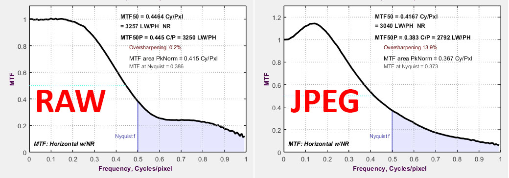 Il JPEG in-camera viene sviluppato in modo piuttosto aggressivo, ma senza particolari eccessi. Con preset Dettaglio fine, abbiamo ottenuto dal JPEG 3040 LW/PH, frutto di un oversharpening poco inferiore al 14%. Il punteggio MTF50P, meno sensibile alla sovra-elaborazione del file, restituisce un più realistico 2792 LW/PH – circa 400 meno del RAW sviluppato manualmente, che è un risultato più che normale.