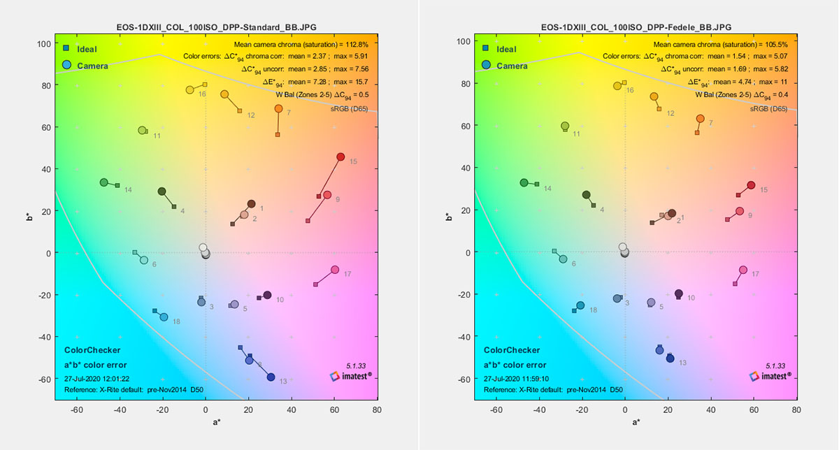 Impeccabile la risposta cromatica, già buona con profilo Standard e davvero eccellente con profilo Fedele, che fa registrare una saturazione pressoché perfetta (105,5%) e un errore puramente cromatico medio inferiore ai 2 punti, encomiabile. Scarti dE94 medi inferiori a 5 punti, vale a dire sotto la soglia di visibilità, completano il quadro.