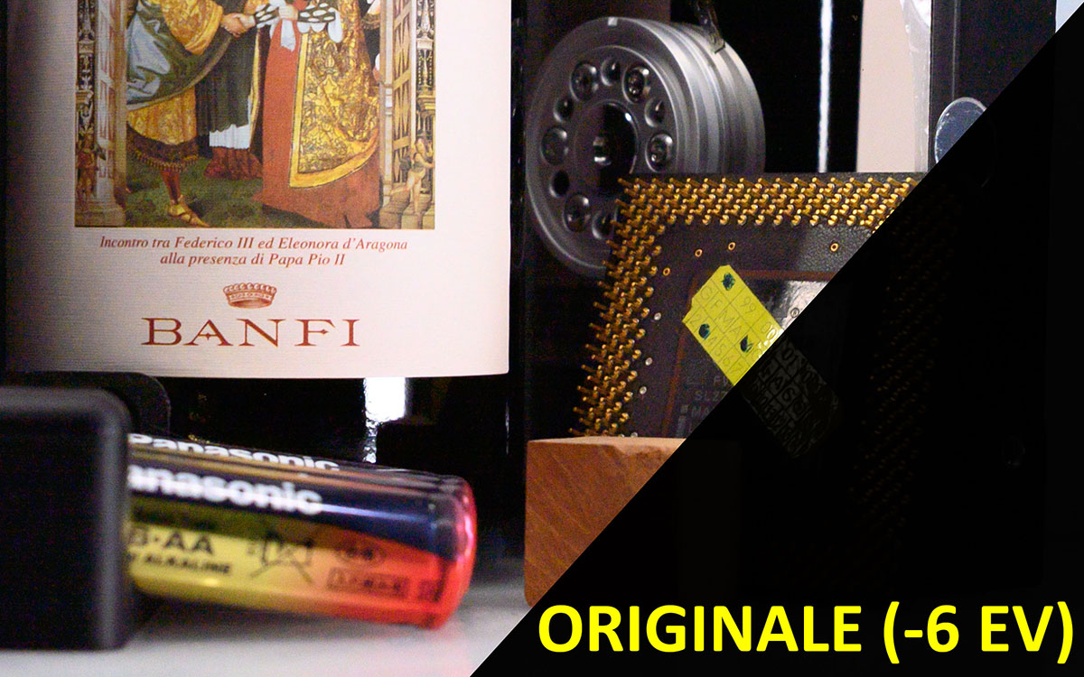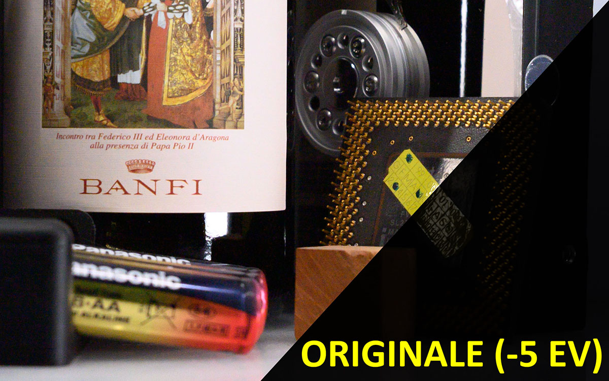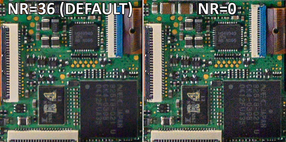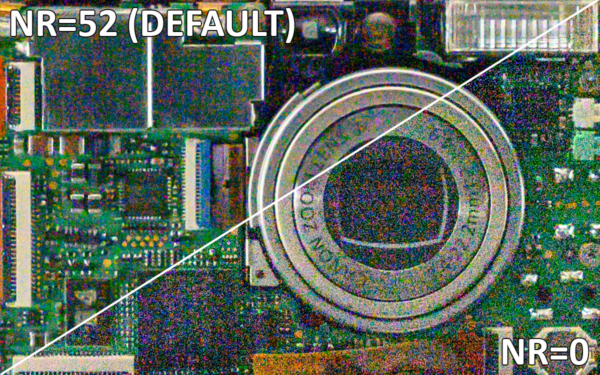 Le immagini sopra (etichetta) sono state ottenute con NR=0, come nostra consuetudine. A titolo di esempio, mostriamo qui il confronto diretto tra NR=0 e NR di default della fotocamera a 51200 ISO.