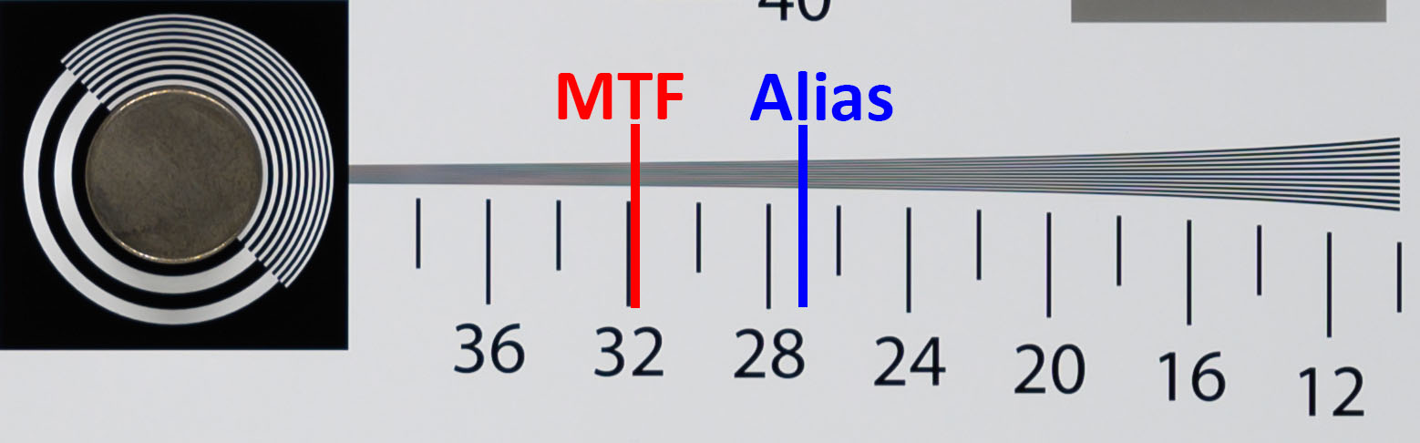 Ciò premesso, partiamo proprio dalla risoluzione, con un punteggio MTF slanted edge di circa 3200 LW/PH. Tale risultato è da intendersi come livello di completa estinzione del pattern, mentre buon dettaglio si può ottenere fino a circa 2700 LW/PH, che è anche il limite di comparsa di fenomeni di aliasing – prendendo quest'ultimo dato come principale, la Z 5 si posiziona non lontana dalla rivale EOS RP, testata con un 24-105mm f/4 di livello superiore.