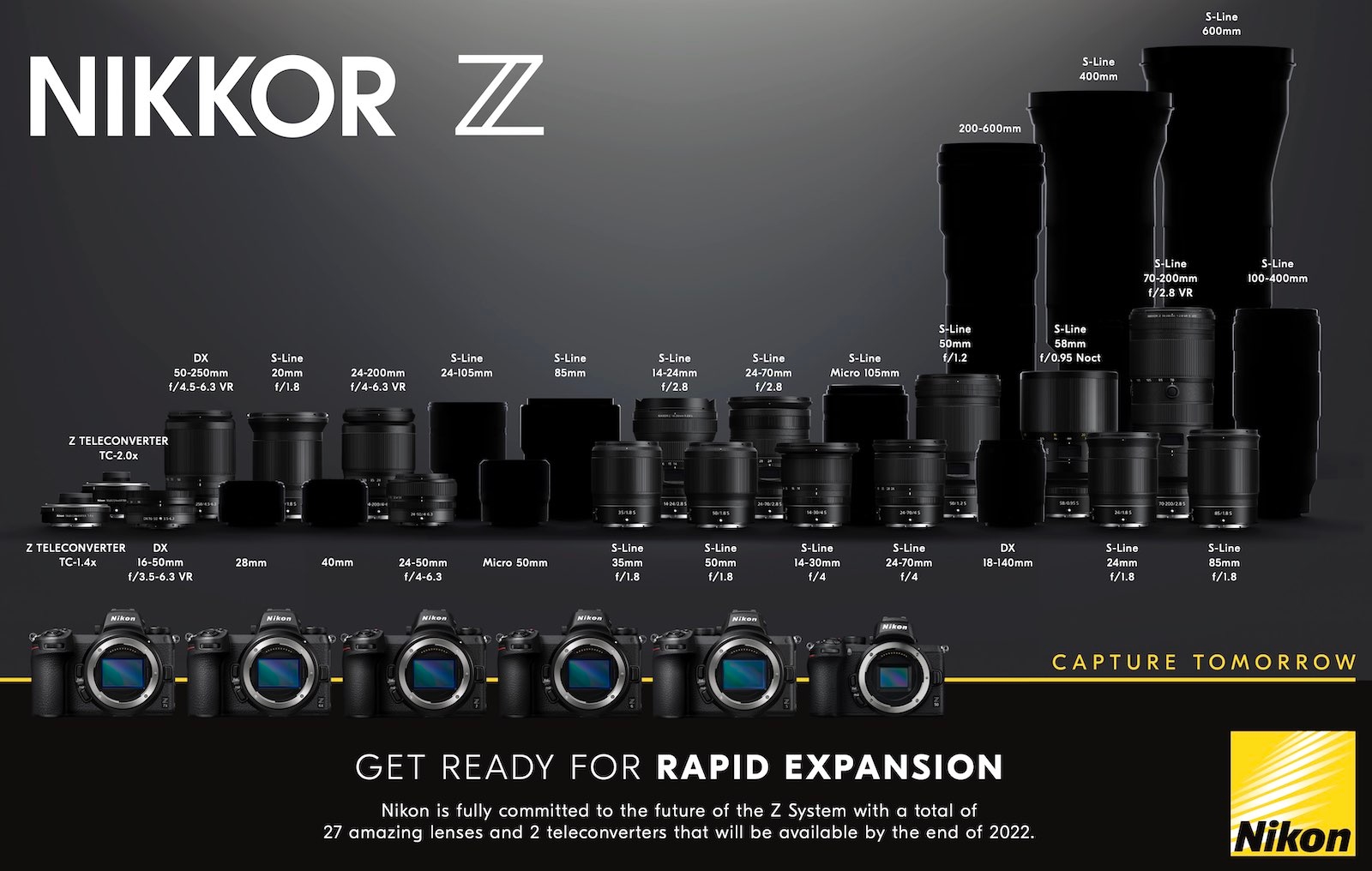 Chiudiamo l'analisi tecnica con un aggiornamento relativo alle ottiche, dato che Nikon ha diffuso un importante aggiornamento della sua roadmap che prevede l'introduzione di ben 11 nuovi obiettivi da qui alla fine del 2022. Tra queste, ci fa piacere trovare innanzitutto due macro da 105mm e 50mm, il primo verosimilmente dedicato alla Full Frame e il secondo alle APS-C.