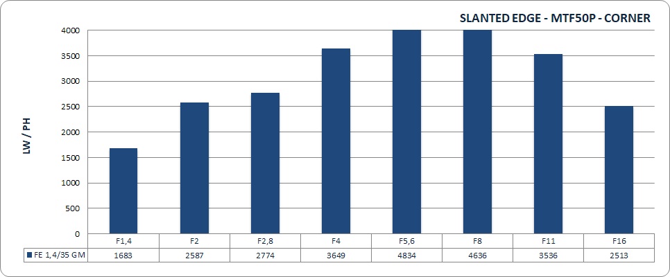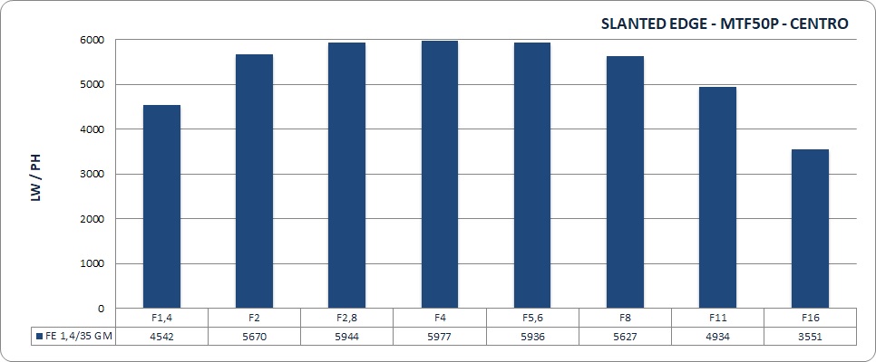 Il trend è simile: fino a f/8, l'FE 1.4735 GM rimane stabilmente sopra quota 3000, e ancora a f/11 sfiora le 3000 LW/PH. A f/16 si nota un calo, ma i valori assoluti rimangono di tutto rispetto.