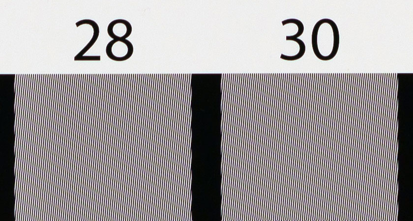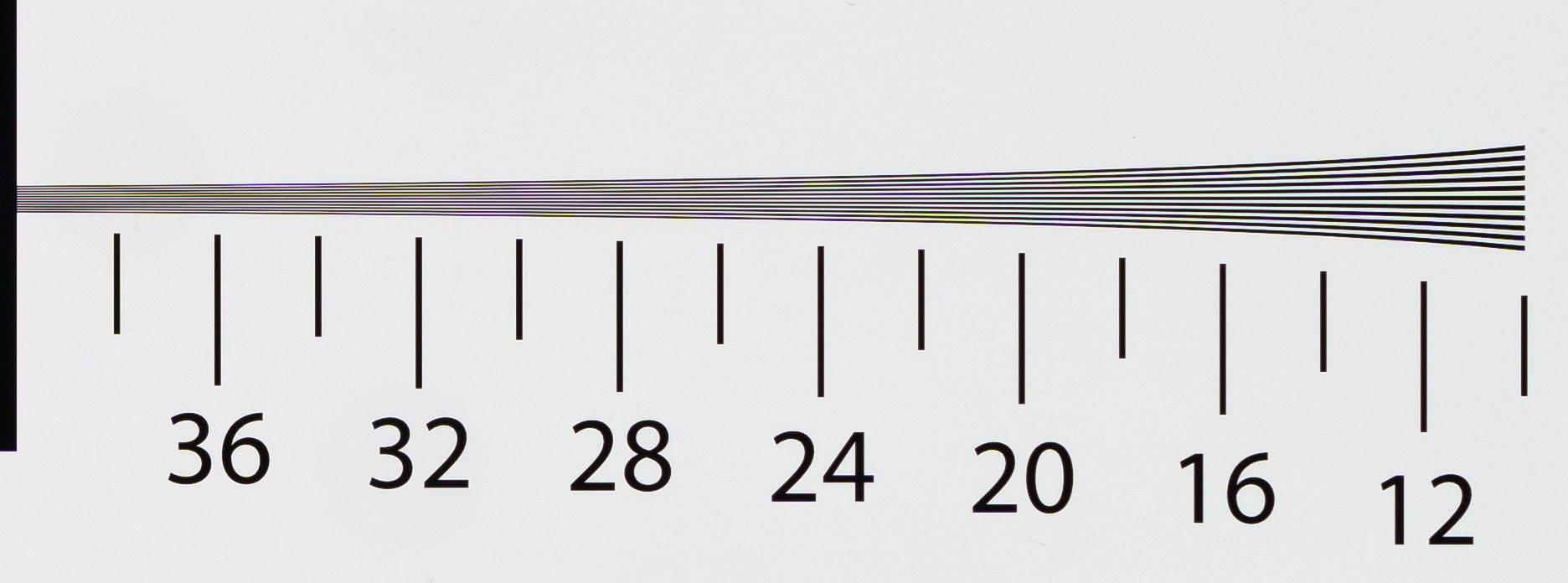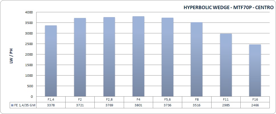 Pubblichiamo anche i risultati hyperbolic wedge che, in generale, possono essere considerate le frequenze fino a cui si ottiene buon dettaglio visivo, in contrapposizione ai punteggi slanted edge che corrispondono invece alle frequenze di completa estinzione del pattern. Con un importante distinguo: pubblichiamo in questo caso i punteggi MTF70, perché i nostri consueti, ma meno restrittivi, MTF50, sono tutti fuori scala!