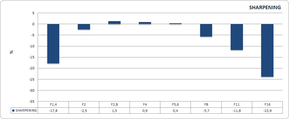 Il punteggio massimo si registra a f/4, ed è pari a ben 5977 LW/PH, ma in effetti tra f/2.8, f/4 ed f/5.6 cambia pochissimo. A F/11 l'ottica è ancora estremamente incisa, a f/16 i grafici mostrano un calo, ma è utile notare il risultato assoluto: circa 3500 LW/PH equivalgono grossomodo al punteggio massimo di una buona Full Frame da 24 Mpixel con ottica al top, utilizzata al suo miglior diaframma di lavoro…