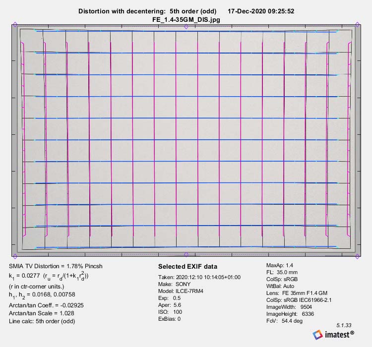 La distorsione è l'unico aspetto per cui questo FE 35mm F1.4 GM non si può dire impeccabile. Non che sia particolarmente elevata, in realtà: parliamo di una distorsione a cuscinetto dell'1,8% circa. Però, considerato che si tratta di un'ottica fissa e osservano come l'obiettivo si comporta in generale, avremmo scommesso su un risultato ancora migliore.