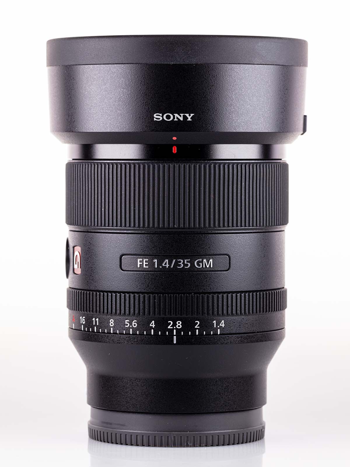 Trattandosi della famiglia top di gamma Sony, è quasi superfluo dire che la costruzione è estremamente curata e di alto profilo. Si parte con una flangia in metallo e si prosegue con un corpo in materiale plastico di elevata qualità che, facilitato anche dalla focale fissa, è completamente privo di giochi meccanici. La prima ghiera che si incontra è quella dei diaframmi, meccanica, la cui scala si estende da f/1.4 a f/16.
