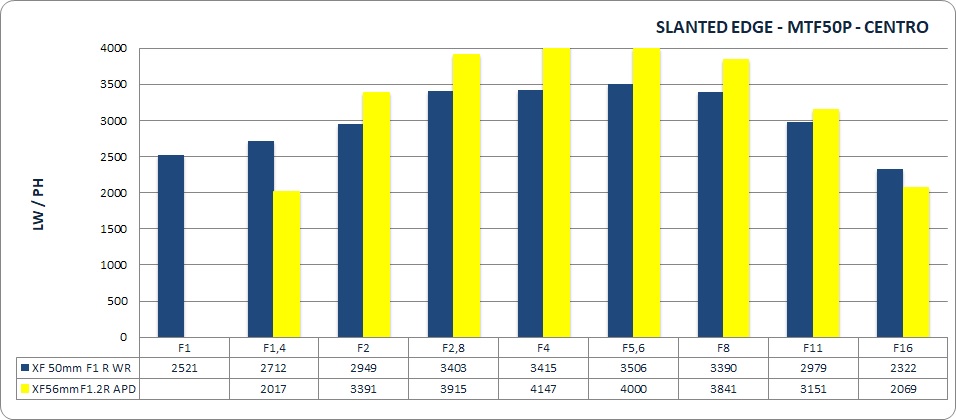 Un confronto interessante, riassunto nel grafico qui sopra, può essere quello con il 56mm F1.2 APD, altra ottica da ritratto per eccellenza del sistema Fuji (in giallo nel grafico) che, come si può vedere, raggiunge valori massimi di risoluzione più elevati ma si ammorbidisce più rapidamente con l'apertura del diaframma. Il nuovo XF 50mm F1, viceversa, garantisce almeno 2500 LW/PH anche a tutta apertura. Il suo sweet spot, a centro immagine, è f/5.6, ma in effetti tra f/2.8 e f/8 le differenze sono trascurabili (risultato evidenziato anche dal grafico 5, che riporta i livelli di sharpening rilevati), e tra f/2 e f/11 l'ottica garantisce sempre grossomodo almeno 3000 LW/PH, una soglia impensabile per ottiche di questo tipo fino a pochi anni fa.