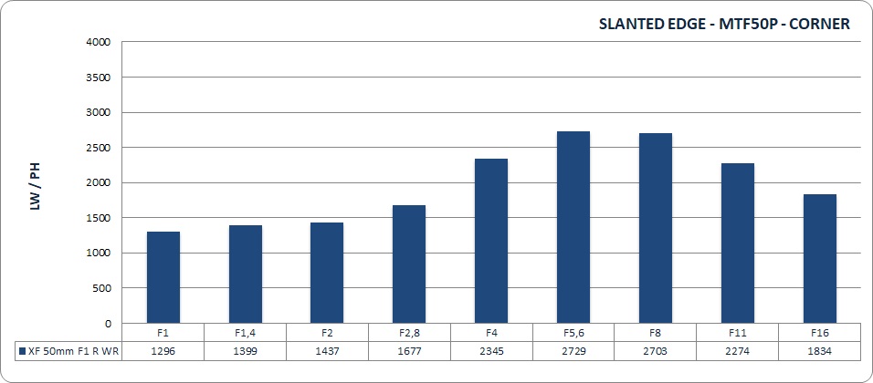 Per avere un'idea più chiara del comportamento dell'ottica, l'abbiamo messa alla prova sulle mire ottiche. Iniziando dall'analisi di risoluzione, possiamo dire che il nuovo XF 50mm F1 R WR sia molto inciso, anche se, come è normale che sia per un'ottica f/1, non il più inciso della gamma Fujifilm. A titolo di confronto, l'intramontabile 35mm F1.4, provato sullo stesso corpo macchina X-Pro 3, ha fatto registrare circa 4000 LW/PH massime, contro le circa 3500 LW/PH del 50mm F1. In termini assoluti, 3500 LW/PH sono comunque tantissime, il che, oltre a sottolineare l'ottimo lavoro progettuale, rende le immagini di forte impatto. Non parliamo, per essere chiari, della resa morbida di un Canon EF 50mm f/1.2, ma piuttosto della resa chirurgica di un Sigma 50mm f/1.4 Art.