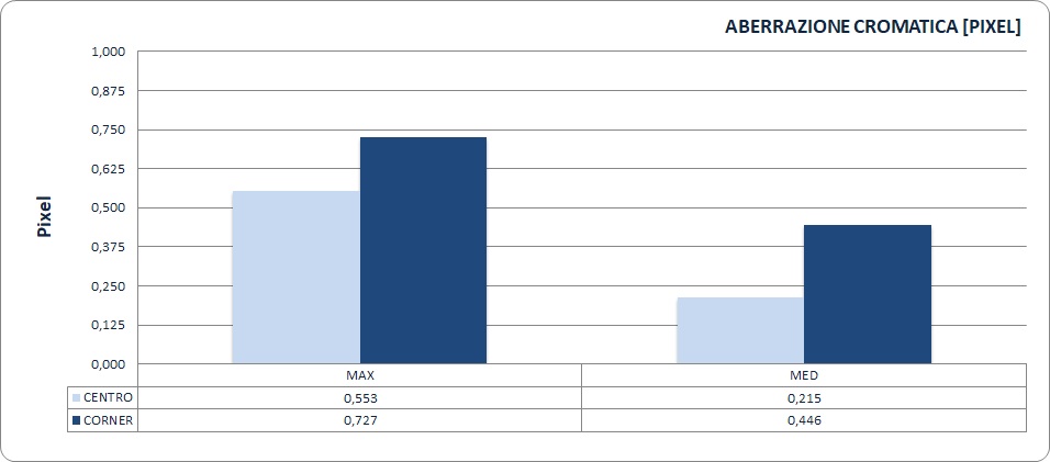 L'aberrazione cromatica risulta sempre perfettamente sotto controllo: meno di un pixel ai bordi alla massima apertura, vale a dire sotto la soglia di visibilità nelle immagini reali.