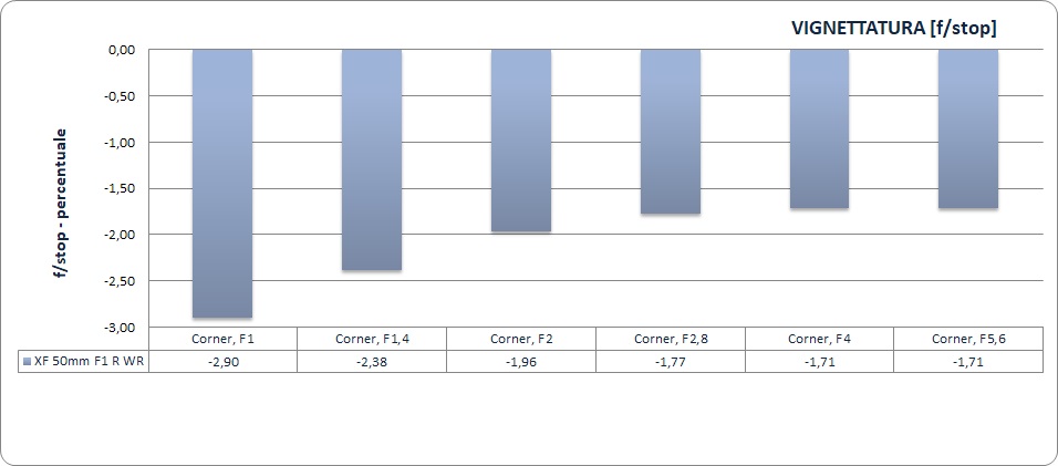 La vignettatura, molto evidente a f/1 (poco meno di 3 stop), è una costante in quest'ottica, tanto da poter essere considerata parte del suo carattere. Per quanto ci riguarda non lo riteniamo un difetto in un'ottica da ritratto, ma chi desidera immagini più asettiche potrà sfruttare la sempre efficace correzione software.