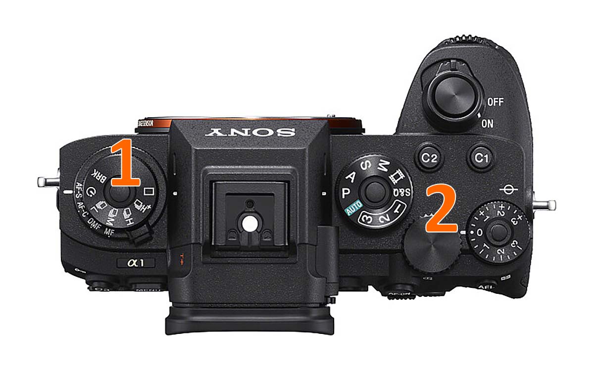 1 – La vista superiore presenta, in più rispetto alla serie A7, la doppia ghiera di sinistra, che da accesso immediato alla modalità di avanzamento e alla modalità AF. Rispetto alla A9, che già adotta tale soluzione, si può notare qui la modalità di avanzamento H+, corrispondente ai fatidici 30 fps.