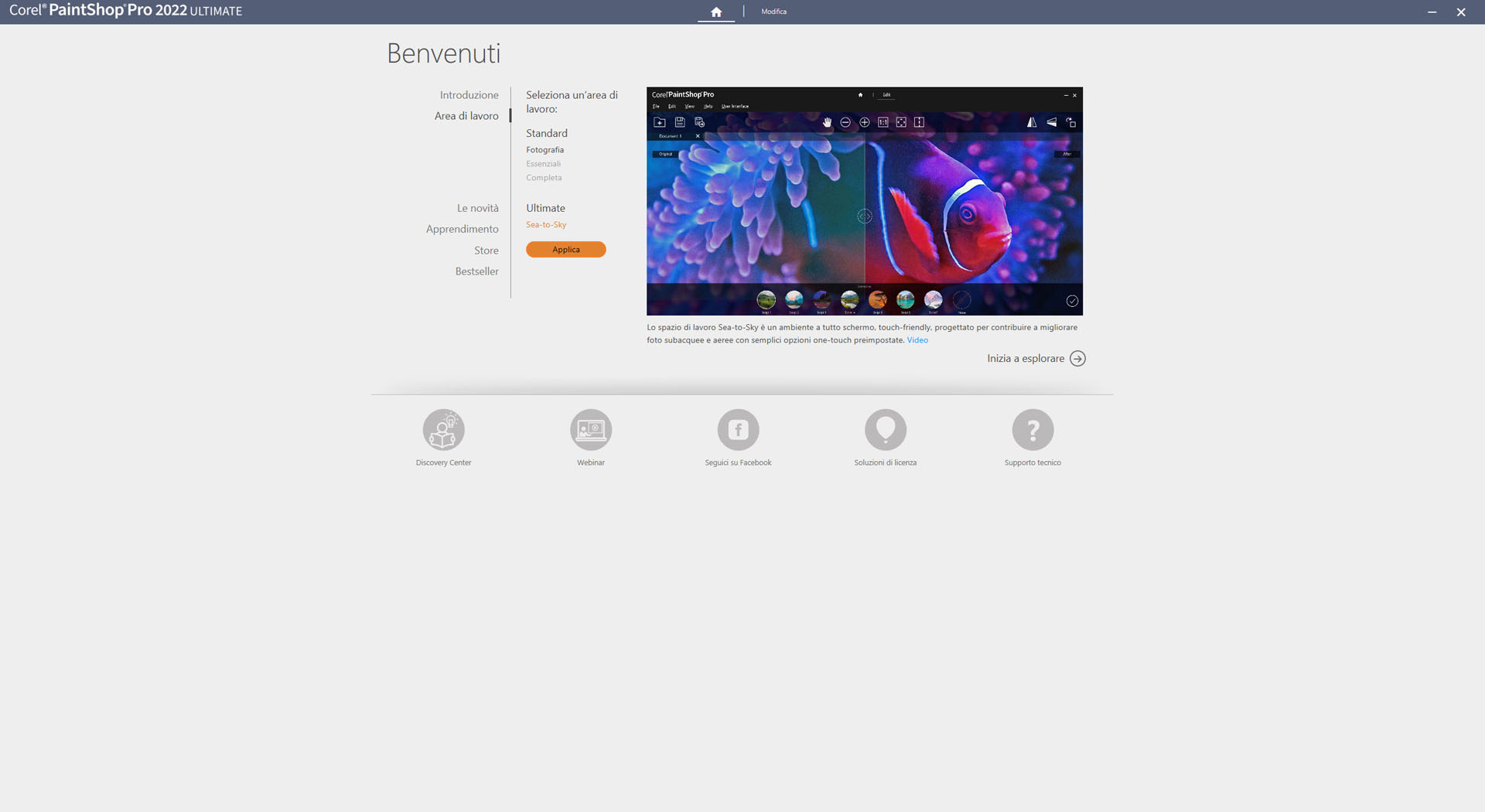 Paint Shop Pro offre già da molto tempo le due aree di lavoro, vale a dire [Strumenti] Essenziali e Completa, che abbiamo sempre apprezzato per la loro capacità di rendere fruibile (e godibile) lo stesso software tanto al principiante quanto all'utente più avanzato. Ora sono state aggiunte le aree di lavoro Fotografia e, solo per la versione Ultimate, Sea-to-Sky.