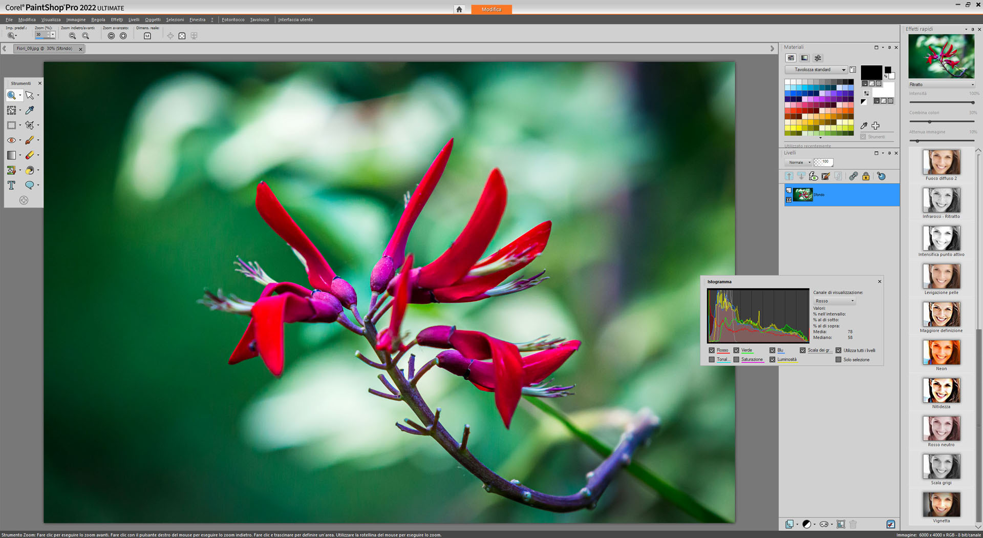 Dodici tavolozze sono disponibili nell'omonimo menu, anch'esse (questo è più consueto) attivabili con un click. Alle due iniziali (Strumenti e Materiali) è così possibile aggiungere, ad esempio, le tavolozze Livelli e Istogramma per chi desidera un approccio più strutturato, o Effetti rapidi per chi preferisce correzioni 1-click. Tutte le tavolozze possono essere fluttuanti o ancorate a un bodo; trascinando la tavolozza compare a schermo un chiaro simbolo di posizionamento, che consente di disporre la tavolozza come si desidera, creando nuove colonne ai margini dello schermo o popolando quelle già esistenti.