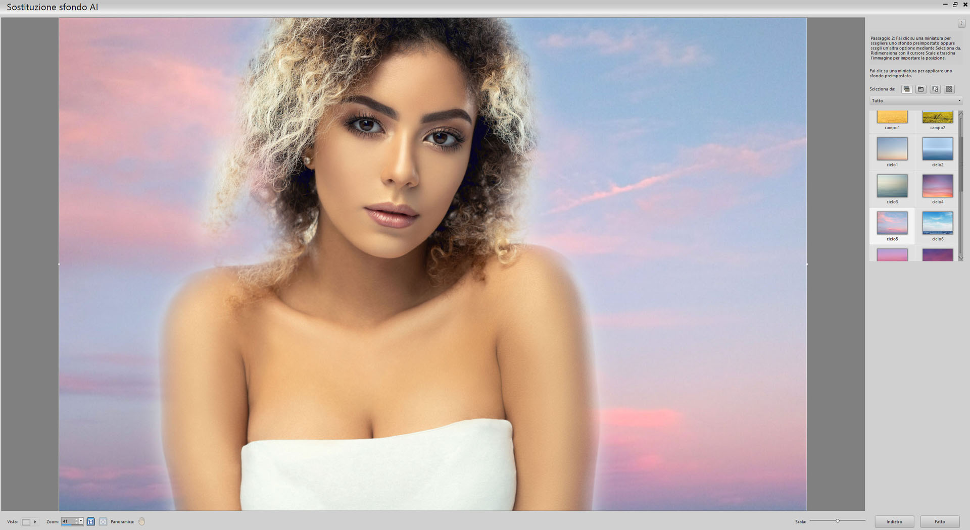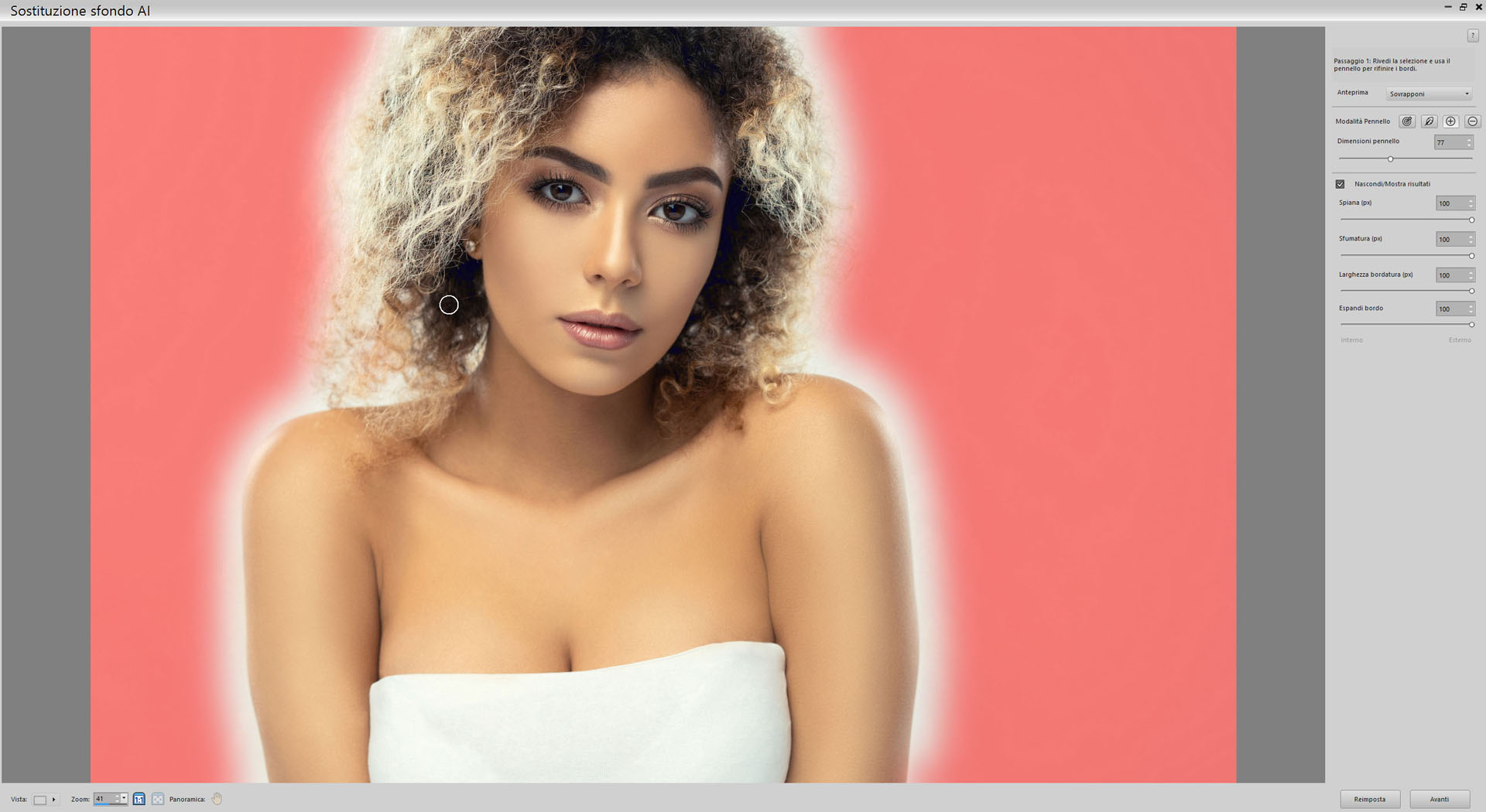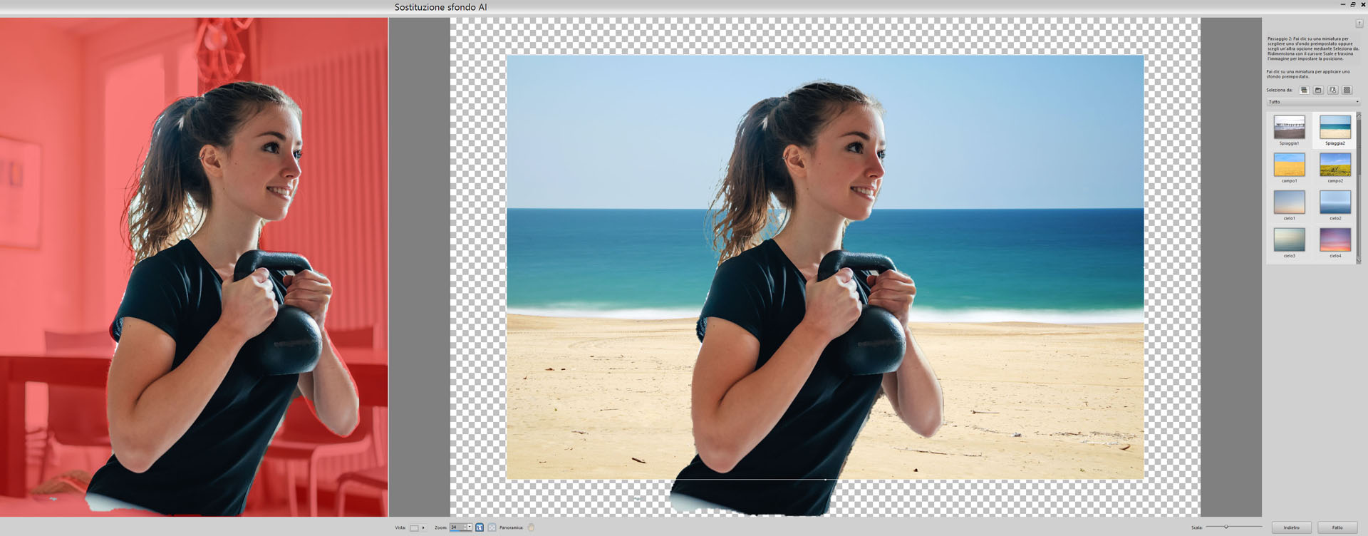 Sostituzione Sfondo AI - La selezione iniziale effettuata dall'AI è spesso approssimativa, così usare lo strumento in completo autatismo porta a risultati poco soddisfacenti.