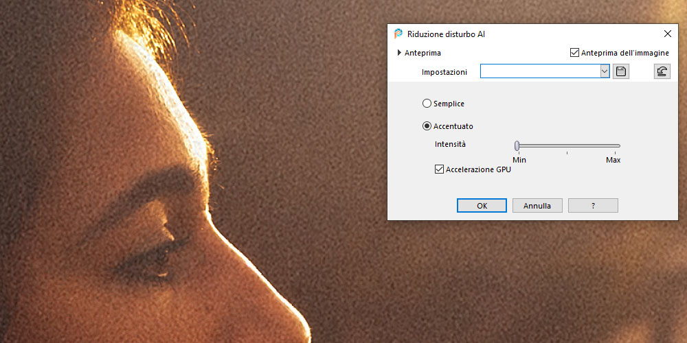 In ogni caso, niente a che spartire con lo strumento classico Rimozione disturbo digitale, non basato su AI ma infinitamente più completo ed efficace. Questo strumento consente di regolare in dettaglio l'effetto, proteggendo se si desidera parti dell'immagine in modo automatico sulla base di tono o luminanza, ed è (anche per questo) uno dei migliori del suo genere.