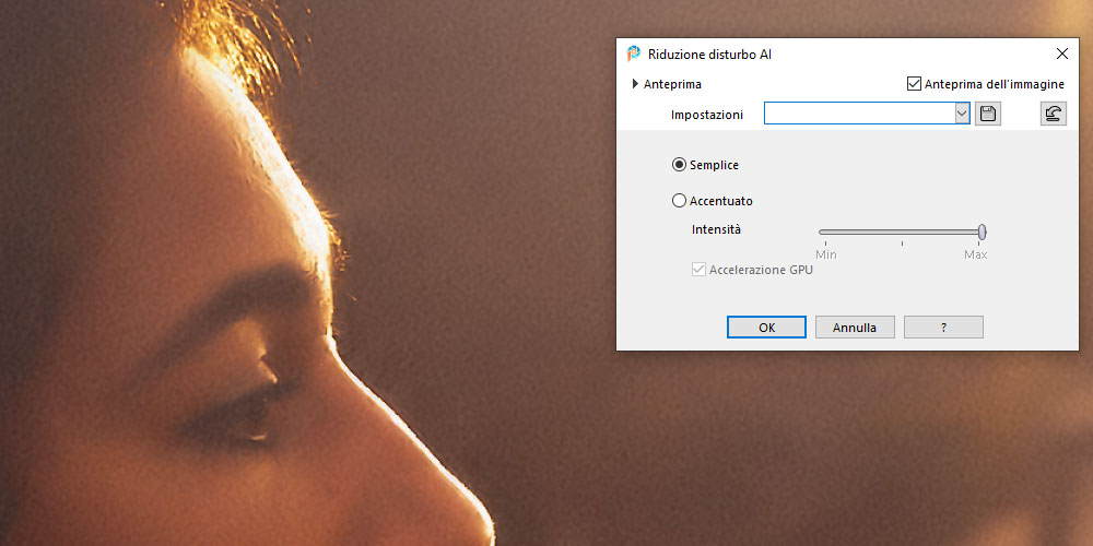 Anche Riduzione disturbo AI si è dimostrato piuttosto deludente. Se utilizzato entro l'area di lavoro Fotografia, lo strumento è completamente automatico e, dobbiamo dire, di limitata efficacia. Se usato entro le aree di lavoro classiche, richiamandolo dal menu Regola, allora offre più controllo, consentendo di scegliere tra una modalità Semplificata e Accentuata, con possibilità per quest'ultima di regolare l'intensità dell'effetto su 3 livelli. Peccato che "Semplice" produca regolarmente un effetto più intenso di "Accentuato" a livello max.