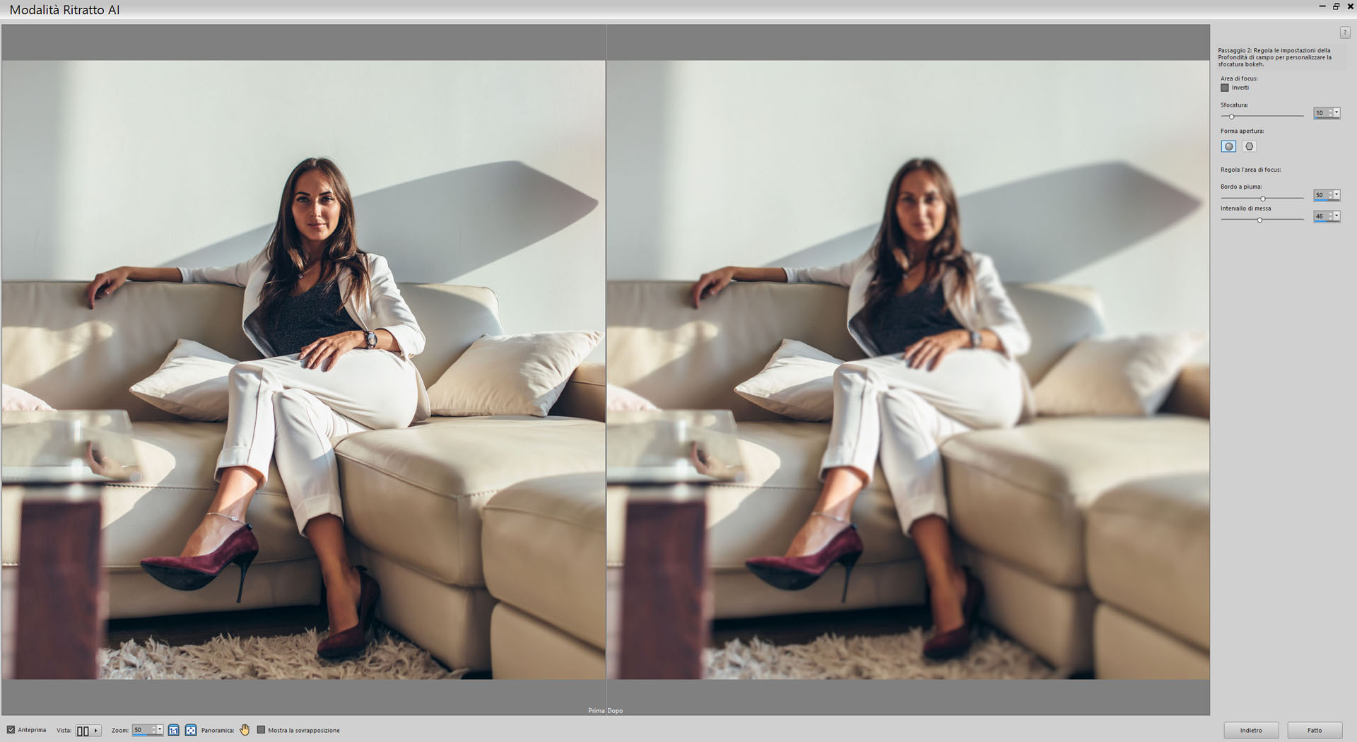 In questo caso, troviamo sopra l'area immagine gli strumenti di zoom e navigazione (mano), oltre alla peculiare ed efficace Vista divisa, che offre uno slider trascinabile per valutare immediatamente e con efficacia l'effetto di ogni intervento in ogni punto dell'immagine.