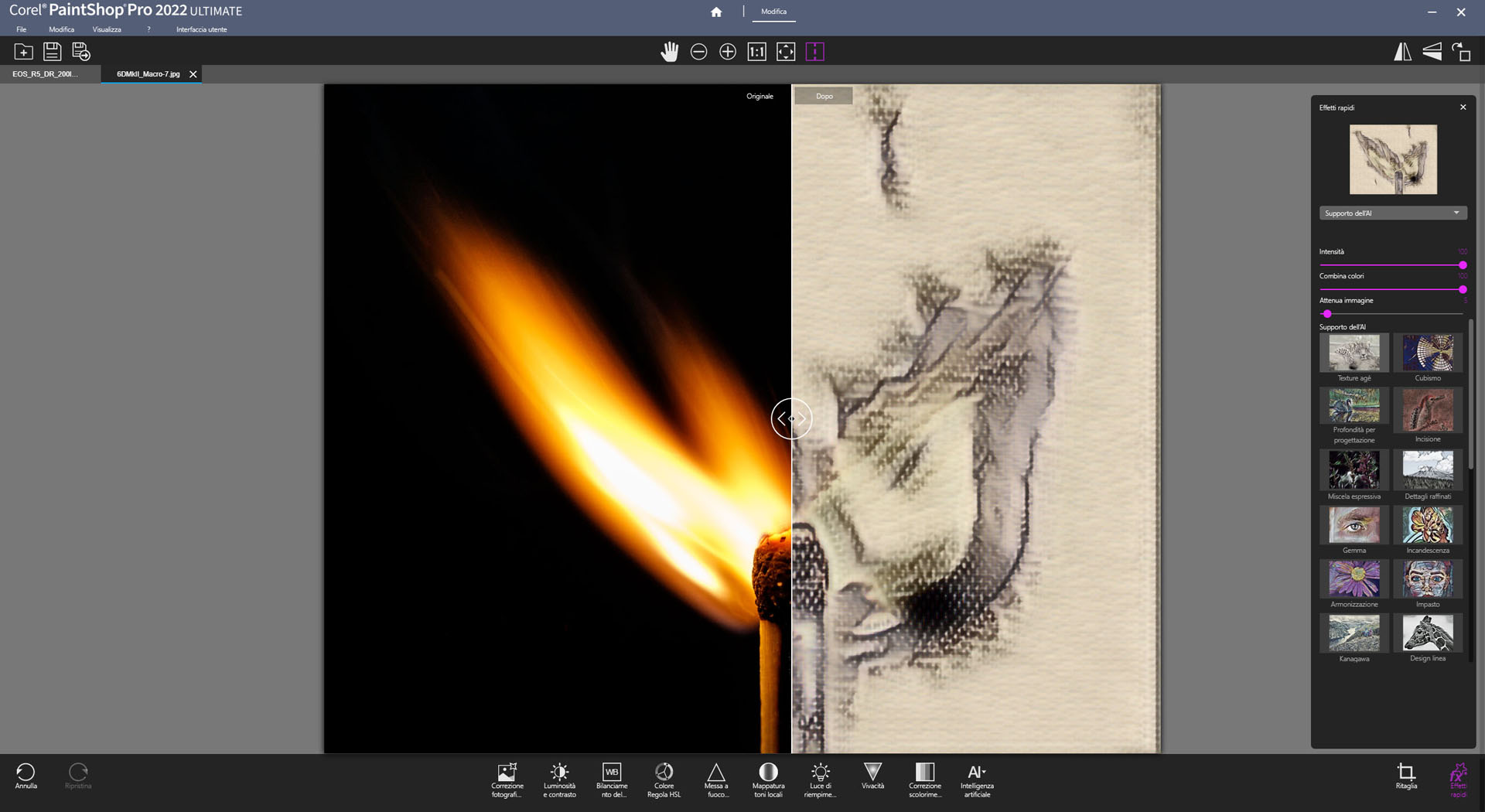 Lo strumento Trasferimento stile AI e il comparatore Prima/Dopo.