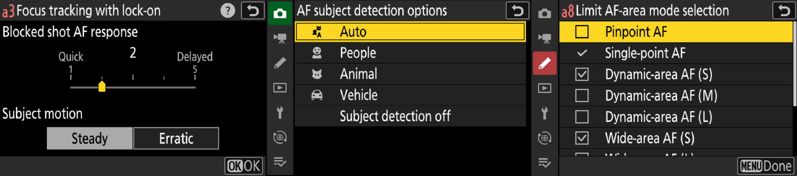 La Nikon Z9 riconosce soggetti umani, distinguendo volti, occhi e torso, nonché soggetti animali e veicoli. Non è strettamente necessario indicare preventivamente alla fotocamera il tipo di soggetto, ma è possibile farlo per restringere ulteriormente il campo e limitare le selezioni errate quando diversi tipi di soggetti coesistono nella stessa immagine.