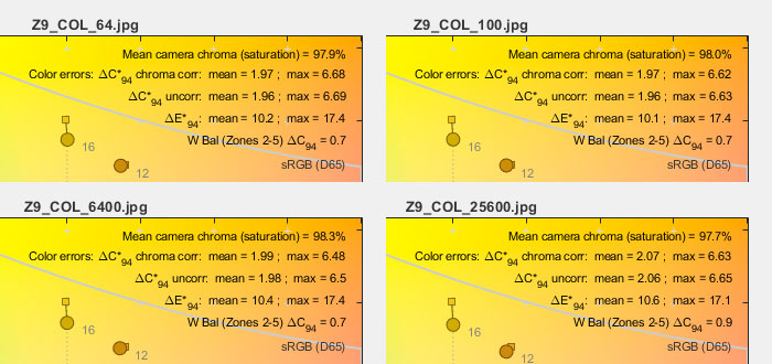 Infine, come ultima digressione sul tema risposta ad alti ISO, ci teniamo a sottolineare l'eccezionale stabilità della risposta cromatica esibita dalla Z9 a tutte le sensibilità native. Di fatto, da 64 A 25.600 ISO, saturazione, punto di bianco ed errori cromatici (indicativi della risposta cromatica) sono identici entro il margine di errore del test. E questo è, per un certo tipo di professionista, un aspetto ancora più importante del rumore – un pizzico di grana può infatti essere tollerato, ma il colore del main sponsor non può essere stravolto…
