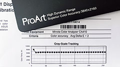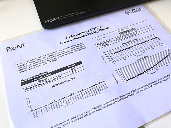 ASUS ProArt PA329CV viene calibrato in fabbrica, così che l'utente possa avere la garanzia di utilizzare un monitor accurato anche se non dispone di strumenti di calibrazione. A testimoniare il comportamento del monitor troviamo, nella confezione, un report di calibrazione che indica il risultato delle operazioni di calibrazione effettuate garantite dal marchio Calman Verified.