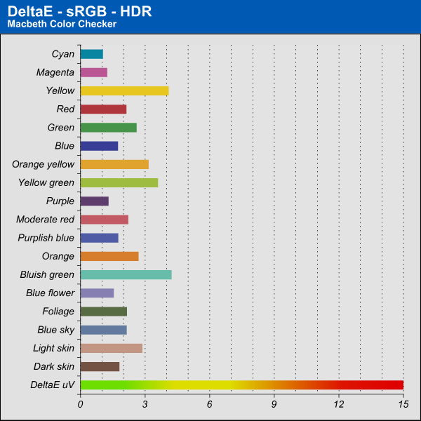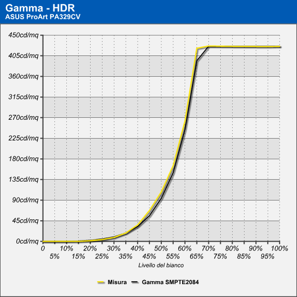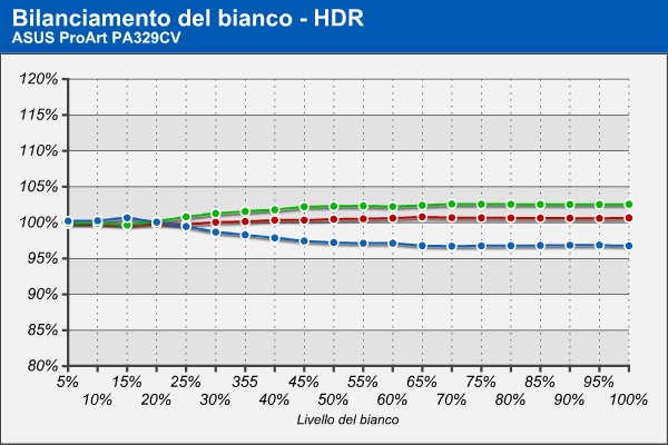 Il monitor ASUS ProArt PA329CV si fregia della certificazione VESA DisplayHDR 400, che tra le certificazioni che il VESA prevede per le specifiche HDR è quella meno severa (si potrebbe dire, con un po' di polemica verso il VESA, che "non è vero HDR"). Per ottenere questa certificazione basta infatti un monitor capace di esprimere una luminanza di picco di almeno 400 candele su metro quadro, una profondità cromatica di 8-bit, la capacità di gestire il global dimming e una copertura almeno del 95% dello spazio colore REC BT.709. ProArt PA329CV rispetta e supera tutti questi parametri, facendo rilevare una luminanza di picco di 425 candele su metro quadro e un triangolo di gamut più ampio rispetto al riferimento. In modalità HDR il bilanciamento del bianco non è impeccabile, e di conseguenza si ripercuote un poco sulla fedeltà cromatica, che resta comunque di un buon livello. E' chiaro però che le specifiche VESA DisplayHDR 400 non sono pensate per la produzione di contenuti, ma per la semplice fruizione e per offrire all'utente un'esperienza HDR basilare.