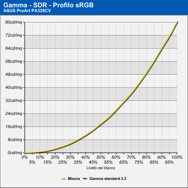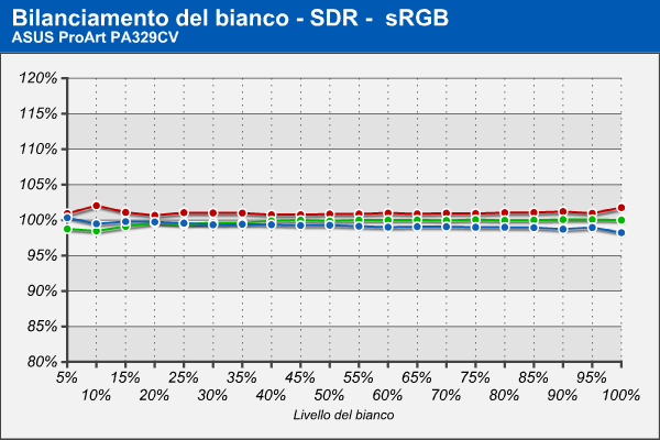 L'analisi del preset sRGB permette di riscontrare un comportamento davvero di alto livello per questo monitor ASUS ProArt PA329CV. Il primo passo nella nostra analisi è, come di consueto, la verifica del bilanciamento delle componenti RGB lungo tutta la scala di grigi: rileviamo un buon equilibrio con scostamenti minimi rispetto al riferimento e tali da non essere pressoché percepibili ad occhio nudo, con la conseguenza di una resa complessiva d'immagine che risulta neutra e priva di dominanti indesiderate. Proseguendo con l'analisi della progressione tonale rileviamo anche qui un ottimo comportamento, con una curva di gamma che procede in maniera corretta e rispettosa del riferimento 2.2. La luminanza massima registrata con il preset sRGB è di 80 candele su metro quadrato, per un rapporto di contrasto nativo rilevato di 1138:1. Non deve stupire un livello così contenuto di luminanza del bianco, poiché si tratta di un valore considerato confortevole e adeguato per operare in ambienti dalla bassa illuminazione, ritenuto ideale per impieghi di fotoritocco, grafica e produzione video. Passando all'aspetto cromatico, rileviamo un gamut che coincide in maniera pressoché perfetta con lo spazio colore sRGB, coprendolo completamente. Ecco quindi che come si spiegava poco sopra, e a valle delle analisi effettuate fin qui, la verifica della fedeltà cromatica ci presenta un risultato che rasenta l'eccellenza: riscontriamo infatti, come promesso dai dati di targa, un Delta E medio inferiore a 2 (0,92 per la precisione), con pochissimi campioni che superano appena il valore di 1, spingendosi al massimo a 1,64.
