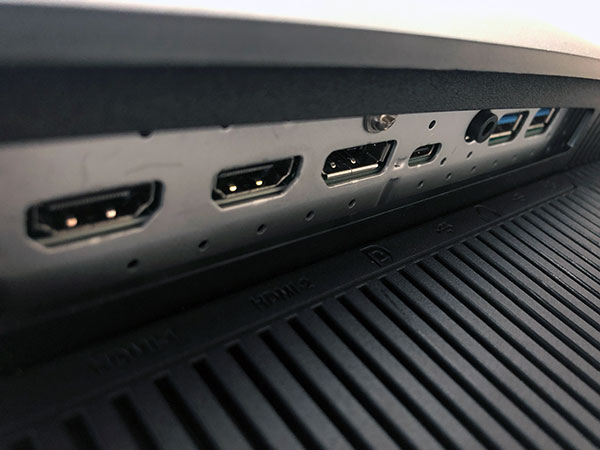 Sul retro sono raccolte le porte di collegamento: troviamo una porta USB-C con Power Delivery fino a 90W, due porte USB, due porte HDMI 2.0 e un porta DisplayPort e un connettore minijack per cuffie o altoparlanti esterni (il monitor integra comunque due speaker da 1,2W che, a meno di esigenze specifiche, non rendono necessario l’impiego di altoparlanti). L’alimentatore è integrato.
