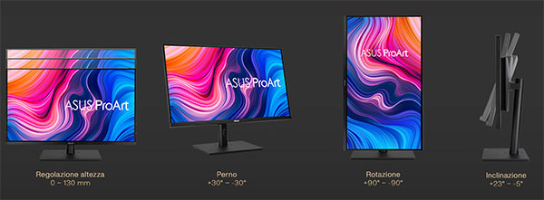 A prescindere dalla soluzione scelta, il braccio che regge il display è il medesimo: un elemento tubolare provvisto di un’apertura alla base per il passaggio dei cavi, così da aiutare a mantenere ordinata la postazione di lavoro. Il braccio può ruotare sulla base di 30 gradi verso destra e verso sinistra, mentre sulla sommità del braccio è presente lo snodo che consente al monitor di inclinarsi di 23 gradi verso l’alto e di 5 gradi verso il basso, oppure di passare all’assetto Pivot con una rotazione di 90 gradi. Lo snodo può infine scorrere sul braccio permettendo di regolare l’altezza del monitor.