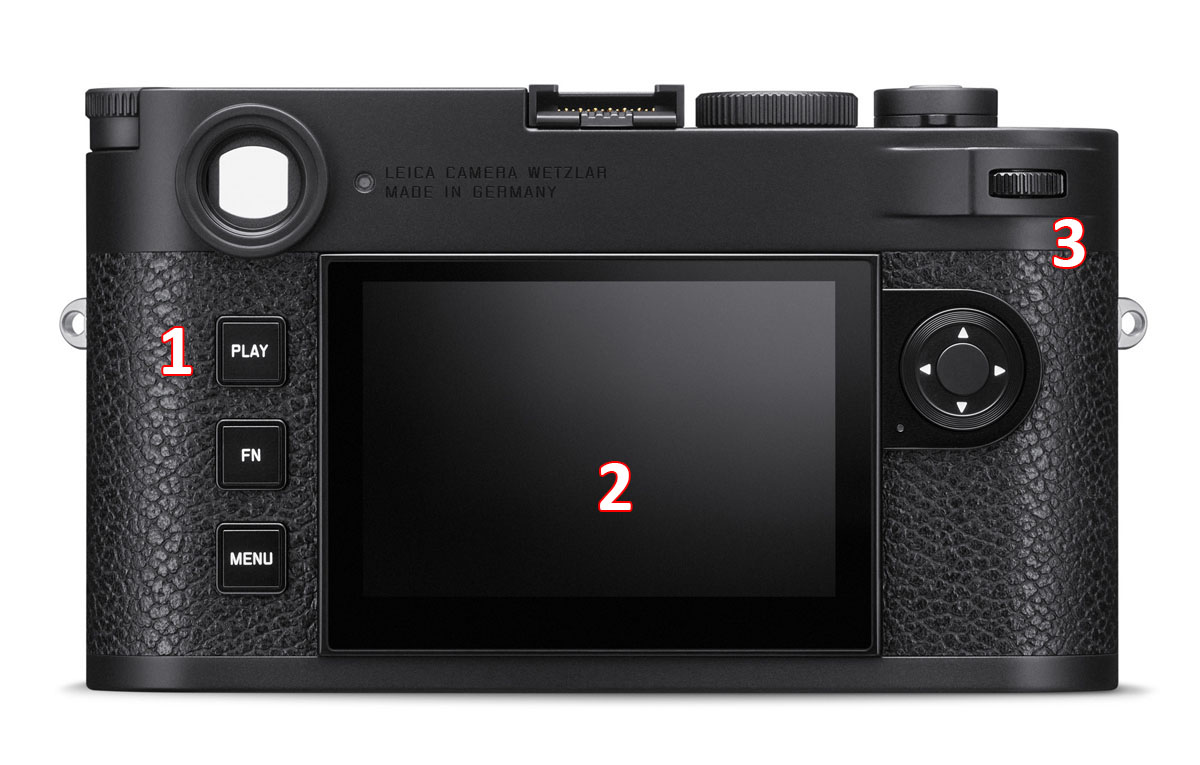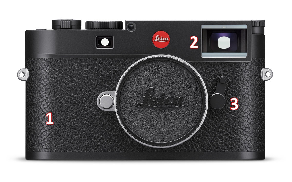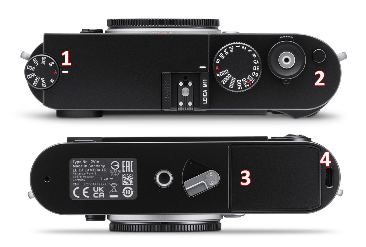 1 – La ghiera ISO, introdotta con la precedente generazione, ora mostra una delle novità della M11: la sensibilità base di 64 ISO. La posizione M consente di accedere alle sensibilità non riportare, nonché, per chi lo preferisce, di modificare la sensibilità in modo "elettronico". Un meccanismo di blocco (sollevare per ruotare) ne impedisce la modifica accidentale.