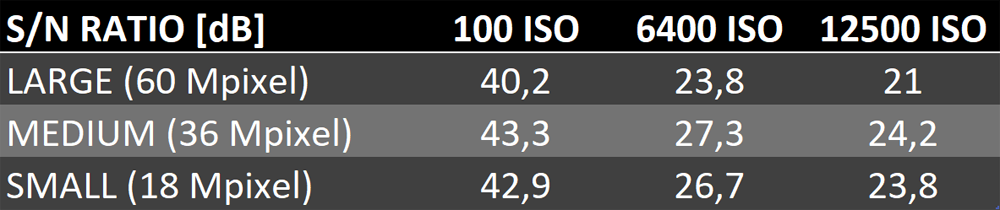 Partiamo da un dato sintetico: il rapporto segnale/rumore, riassunto nella tabella poco sopra, cresce di oltre 3dB passando da 60 a 36 Mpixel a 100 ISO, e arriva a un +3,5 dB a 6400 ISO – una differenza più che tangibile. Passando a 18 Mpixel, invece, il dato non cambia in modo significativo a nessuna delle tre sensibilità campione, anzi la tendenza è quella di un leggero peggioramento.