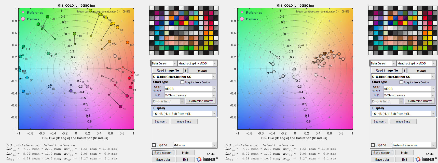 Eccellenti notizie anche dall'analisi cromatica. La saturazione è praticamente perfetta, nell'intorno del 106% a 100 ISO e pressoché costante alle sensibilità superiori almeno fino a 12500 ISO, che come vedremo tra poco rappresentano il limite di buon sfruttamento di questa fotocamera.