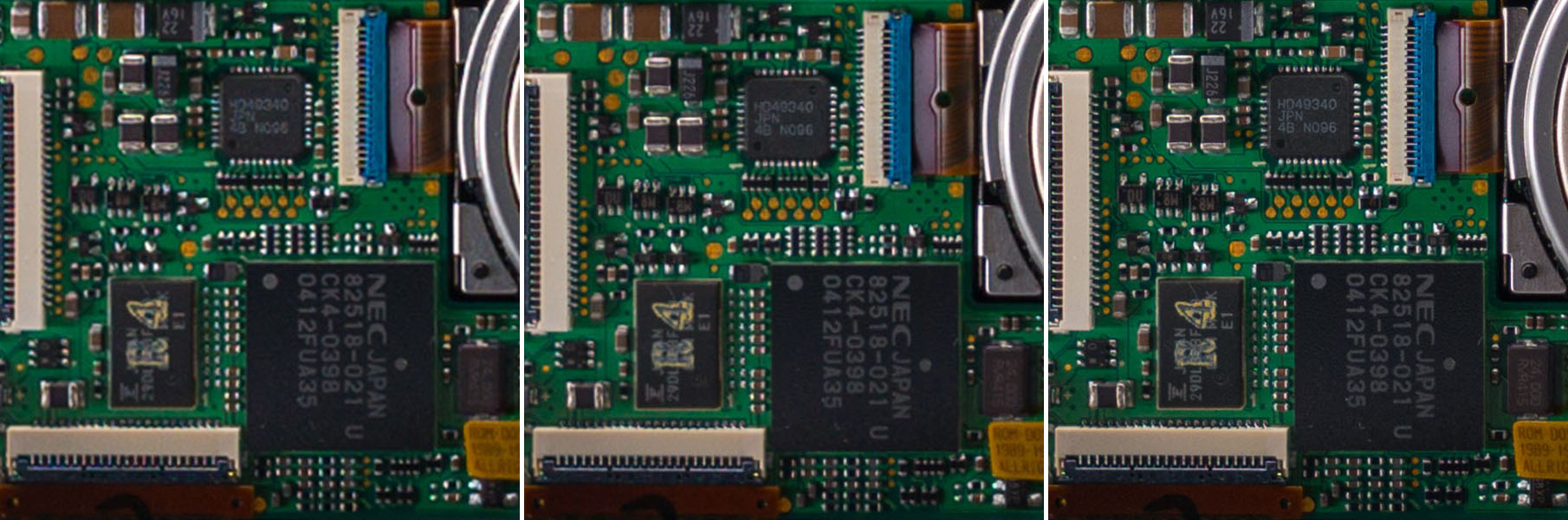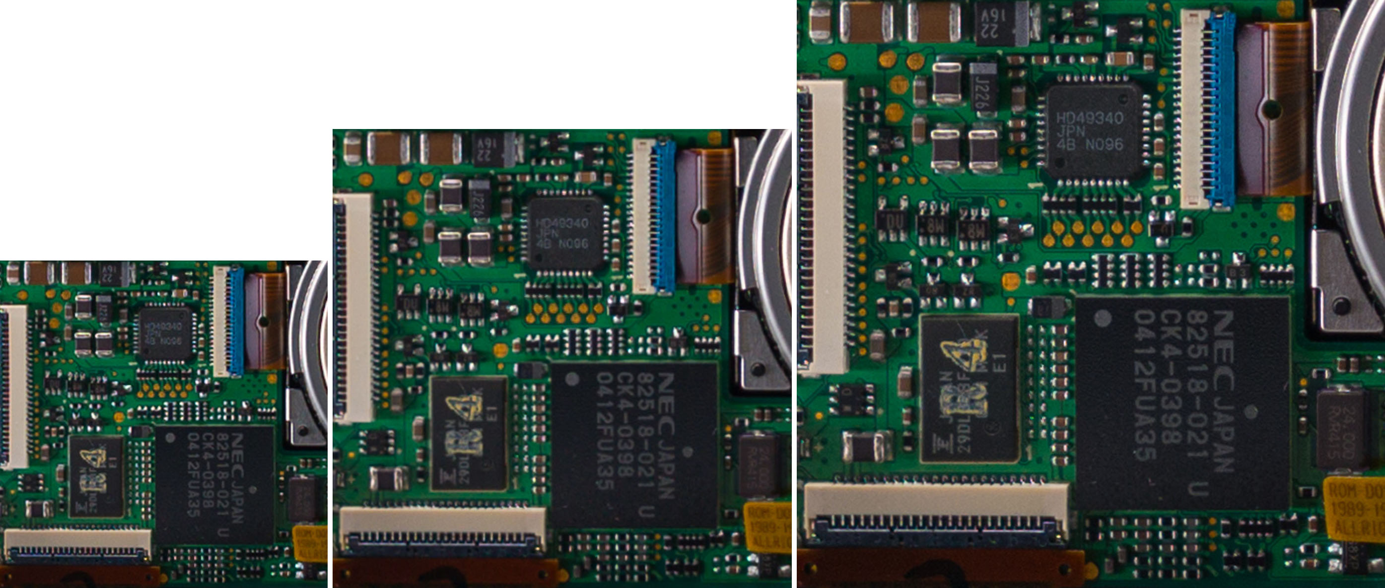Ancora le tre risoluzioni a confronto, da Small (sinistra) a Large (destra). Sopra: ritagli originali. Sotto: gli stessi ritagli equalizzati