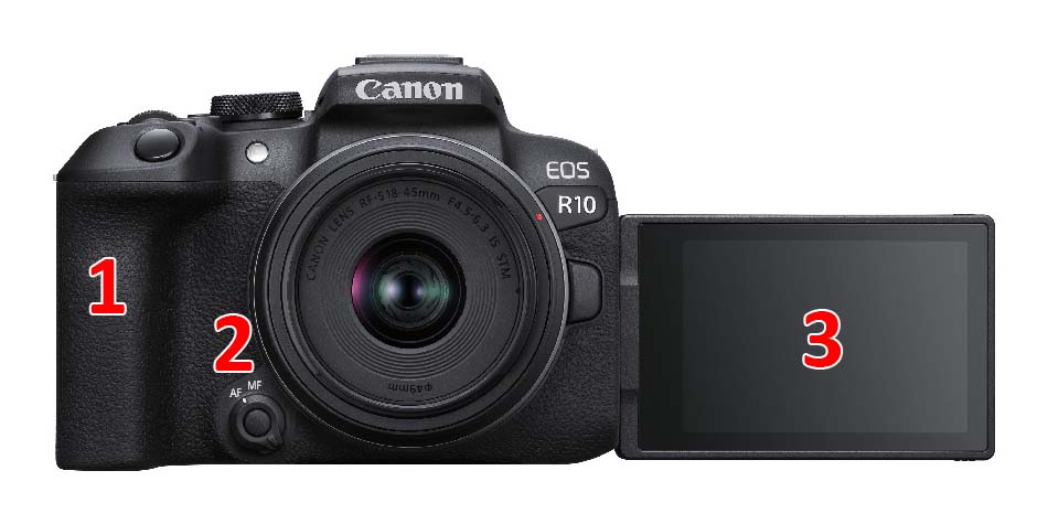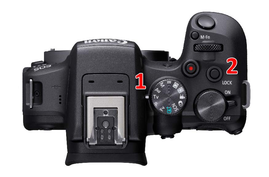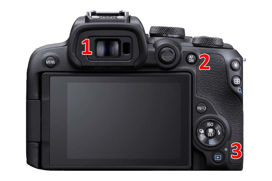 3 – Visto il minore spazio a disposizione, Canon ha semplificato il dorso, riducendo il numero di comandi disponibili rispetto alla R6. L'assenza più vistosa è la ghiera posteriore, al posto della quale troviamo il piccolo PAD direzionale, anch'esso tipico dei modelli di fascia inferiore.