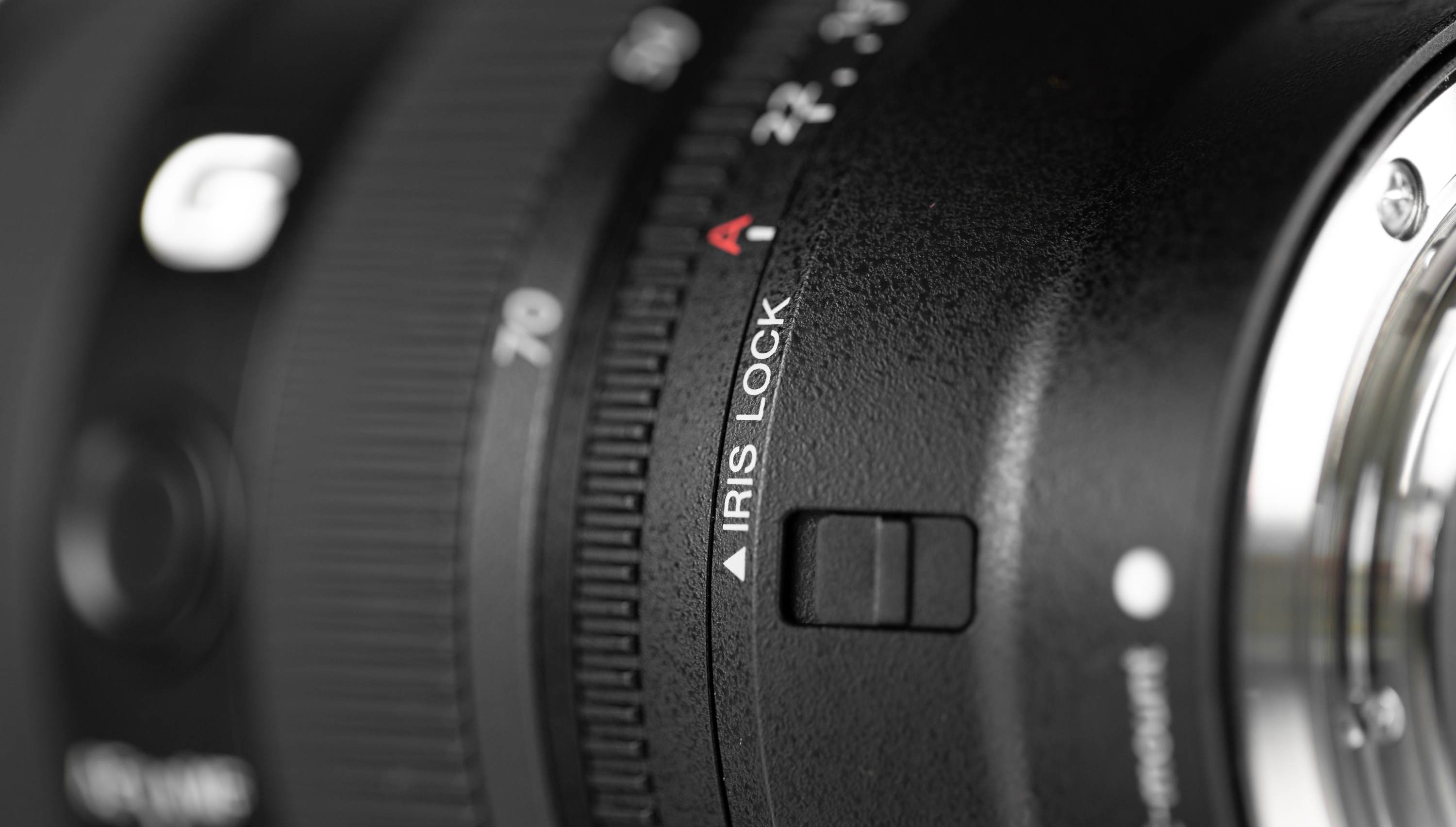 Il diametro del corpo esterno è quasi costante, a partire dalla piccola ghiera dei diaframmi che spazia tra f/4 ed f/22. Due selettori a lei dedicati consentono di scegliere tra un movimento continuo oppure a passi di 1/3 EV (click / de-click), e di bloccare eventualmente la ghiera in posizione Auto oppure nella zona di selezione manuale (IRIS LOCK).