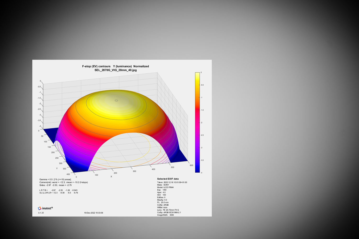 Oltretutto, a 20mm l'effetto non scompare mai, nemmeno ai diaframmi più chiusi (ancora a f/11, parliamo di una perdita media agli angoli di circa 7 EV), e ancora a 70mm la vignetta alla massima apertura è tutt'altro che trascurabile (agli angoli, circa 2- EV @ f/4, circa -1 EV @ f/5,6). A onor del vero, nemmeno il 24-70mm GMaster era fenomenale sotto questo specifico aspetto, ma qui siamo su tutt'altro piano.