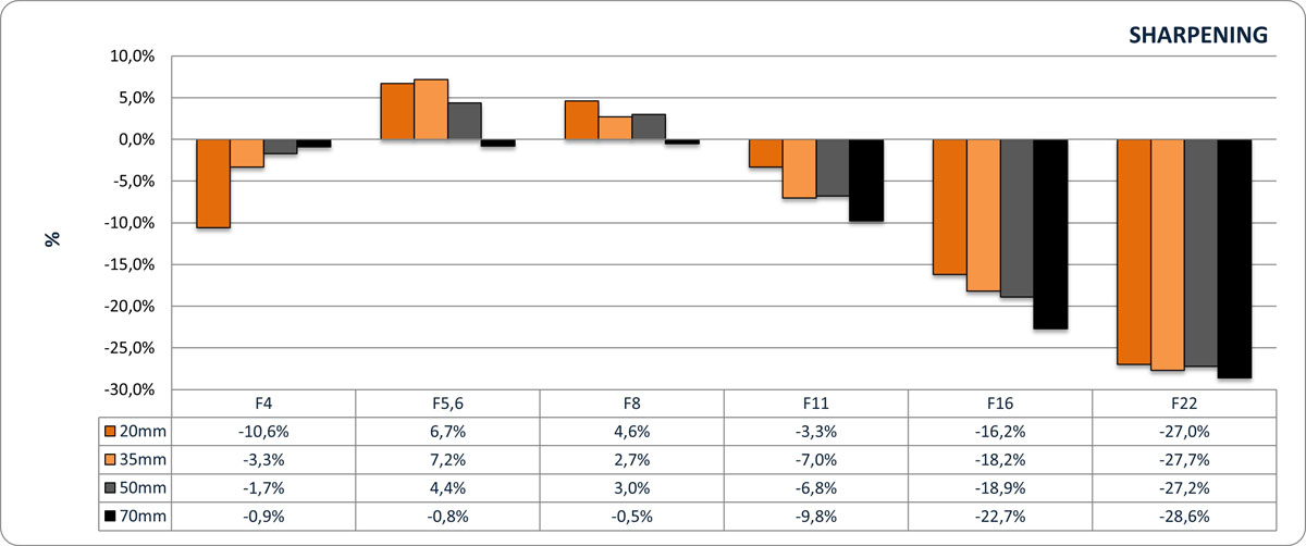 I punteggi migliori si osservano a f/5.6. A diaframmi f/4 e f/8 i risultati sono assolutamente confrontabili anche se, rispetto ad altre ottiche di ultima generazione, questo FE 20-70mm F4 G sembra soffrire leggermente di più alla massima apertura, nonostante non si tratti di un obiettivo super-luminoso.