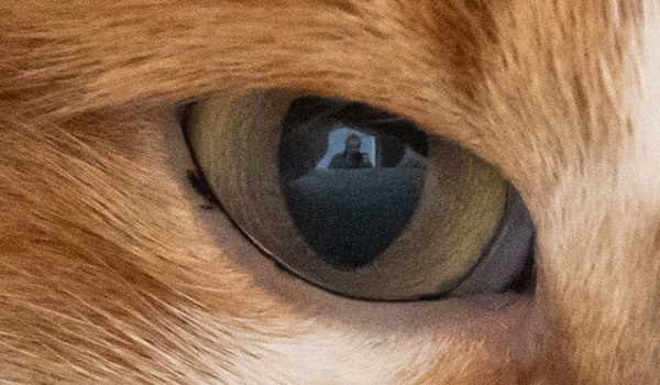 Sopra: immagine intera. Sotto: Particolare a grandezza reale, in cui si può distinguere il fotografo riflesso negli occhi del gatto.