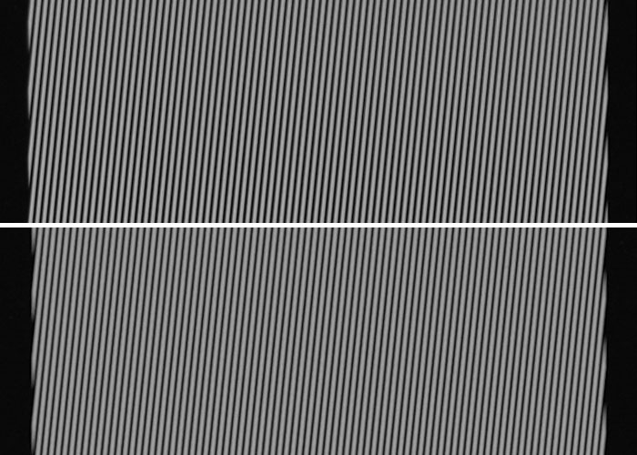 Parlare di micromosso per lo scatto nella metà inferiore è in qualche modo improprio, dato che il soggetto è il target da 3000 LW/PH. Le linee diagonali, per essere chiari, non sono visibili a occhio nudo. Un "vero" micromosso le avrebbe rese illeggibili. Ciò non di meno, lo stabilizzatore riesce a eliminare quel minuscolo movimento residuo e a garantire maggior nitidezza. È per questo prevedibile che, nonostante le misure di risoluzione a tavolino (sempre effettuate con fotocamera su treppiede) siano identiche per Mark IV e Mark V, gli utenti sperimenteranno sul campo un pizzico di incisività in più con la Mark V.