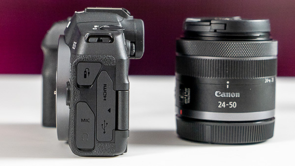 Rispetto a R6 MK II troviamo un mirino a più bassa risoluzione, ma che comunque sfoggia un pannello OLED da 2,36 milioni di punti e refresh rate fino a 120 fps. Tra le altre caratteristiche non da top di gamma troviamo la connettività Wi-Fi a singola banda a 2,4 GHz, mentre è doppio il jack audio, che permette quindi sia l'ingresso di microfoni esterni, sia il monitoraggio tramite cuffie. La porta USB-C può essere sfruttata per la ricarica della batteria e l'alimentazione della fotocamera e permette la connessione al PC per l'utilizzo diretto (senza software aggiuntivi) come webcam per streaming e videoconferenze. A livello di connessioni troviamo la slitta attiva multifuzione che permette anche l'alimentazione degli accessori e il passaggio di dati, ad esempio liberando da cavi e batterie nell'utilizzo dei microfoni compatibili.