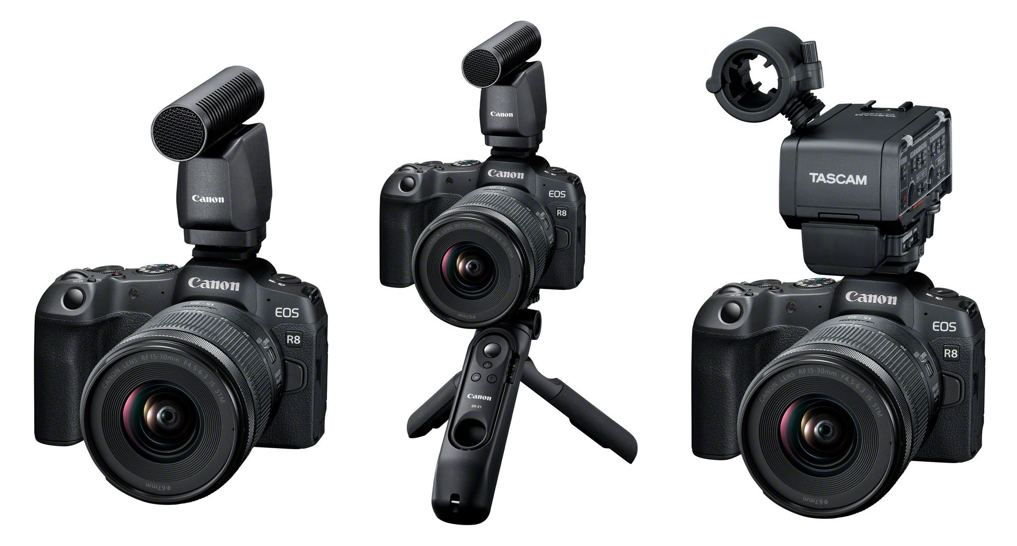 EOS R8 equipaggiata con alcuni accessori dedicati alla ripresa video.