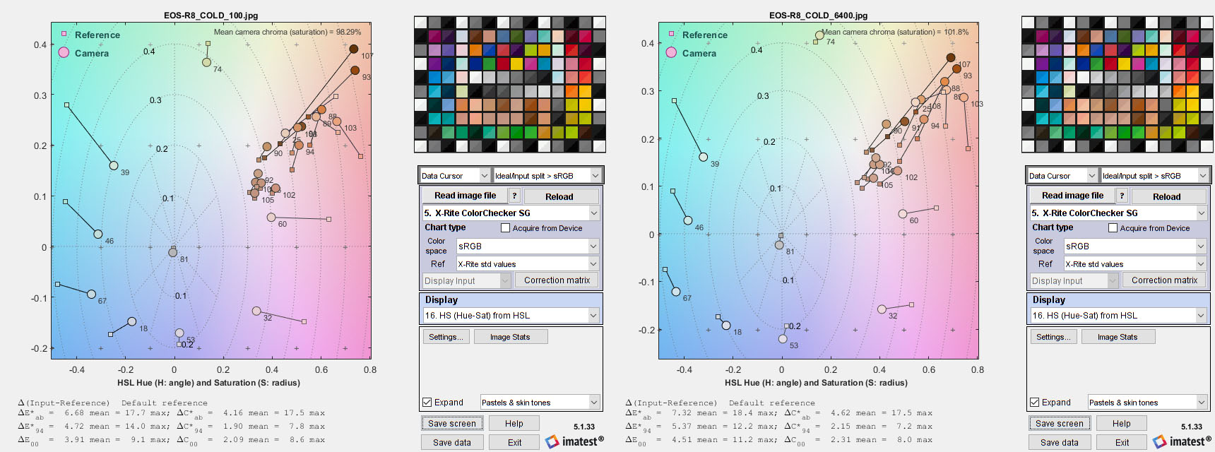Dal punto di vista cromatico, il sistema EOS R si conferma un punto di riferimento. Scarti minimi (a titolo di esempio, citiamo gli errori puramente cromatici dC94 di solo 1,9 punti, contro una soglia di visibilità intorno ai 5 punti), saturazione perfetta e comportamento costante almeno fino a 6400 ISO compresi dipingono un quadro di eccellenza.