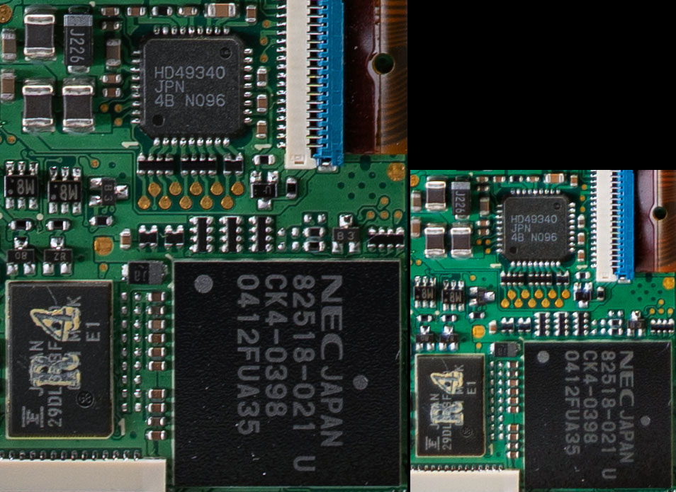 Ovviamente il livello di dettaglio assoluto non è da record (mantenendo l'oversharpening di default, quindi sapendo che il risultato è leggermente ottimistico, abbiamo misurato circa 3500 LW/PH). Mostriamo, a titolo di riferimento, il confronto con la Sony A7R Mark V e il suo sensore da 60 Mpixel. Come si vede la differenza esiste, ma considerato che i pixel della Sony sono 2,5x quelli della Canon, si può ben dire che la R8 esca sorprendentemente bene dal confronto diretto.