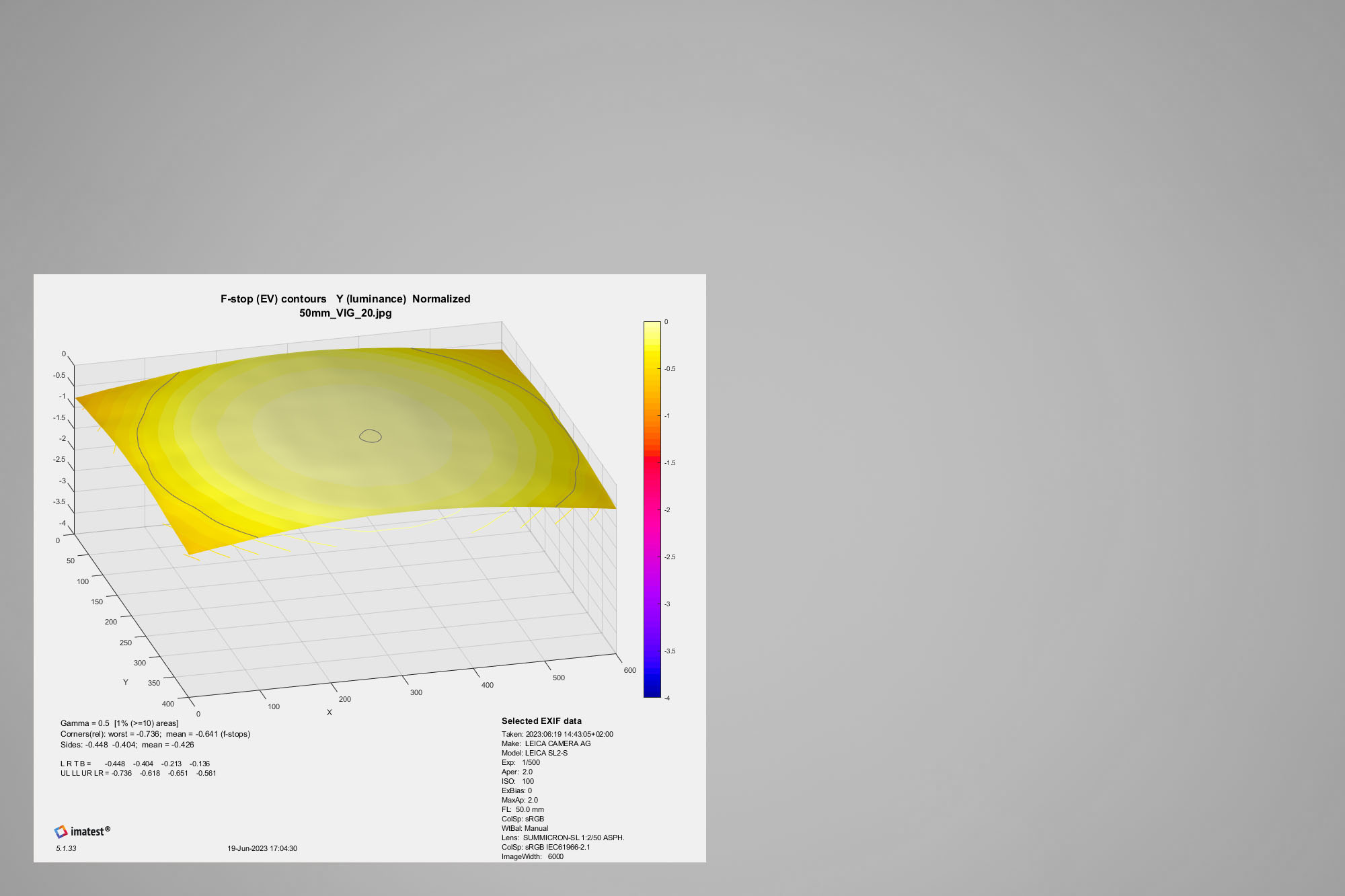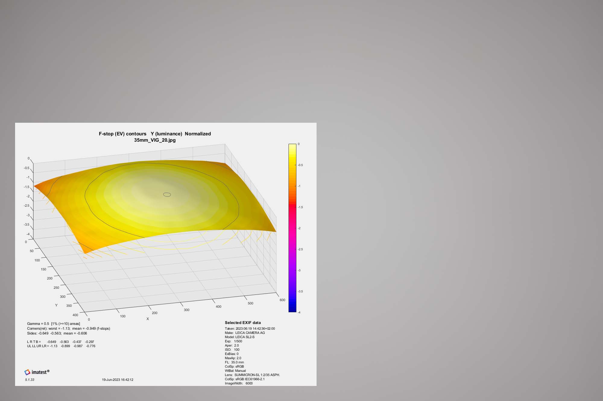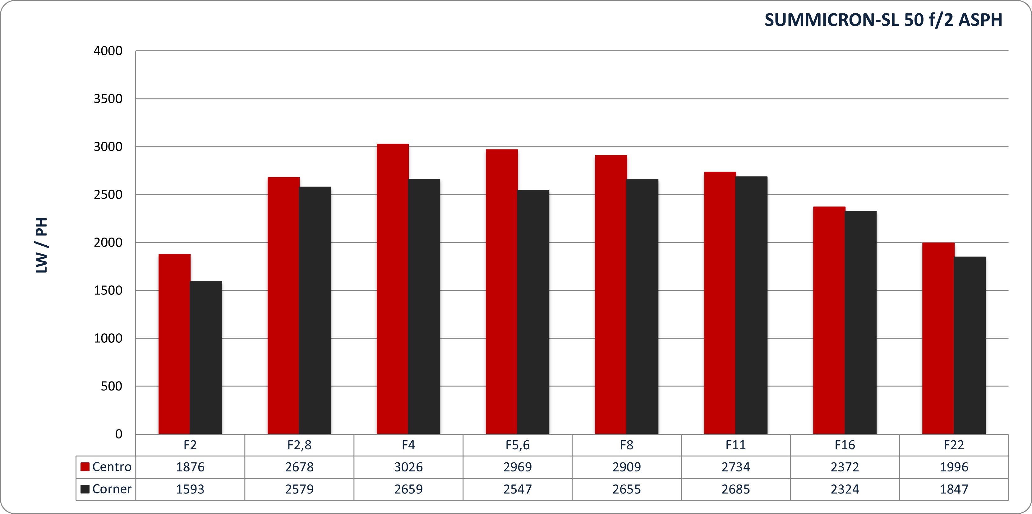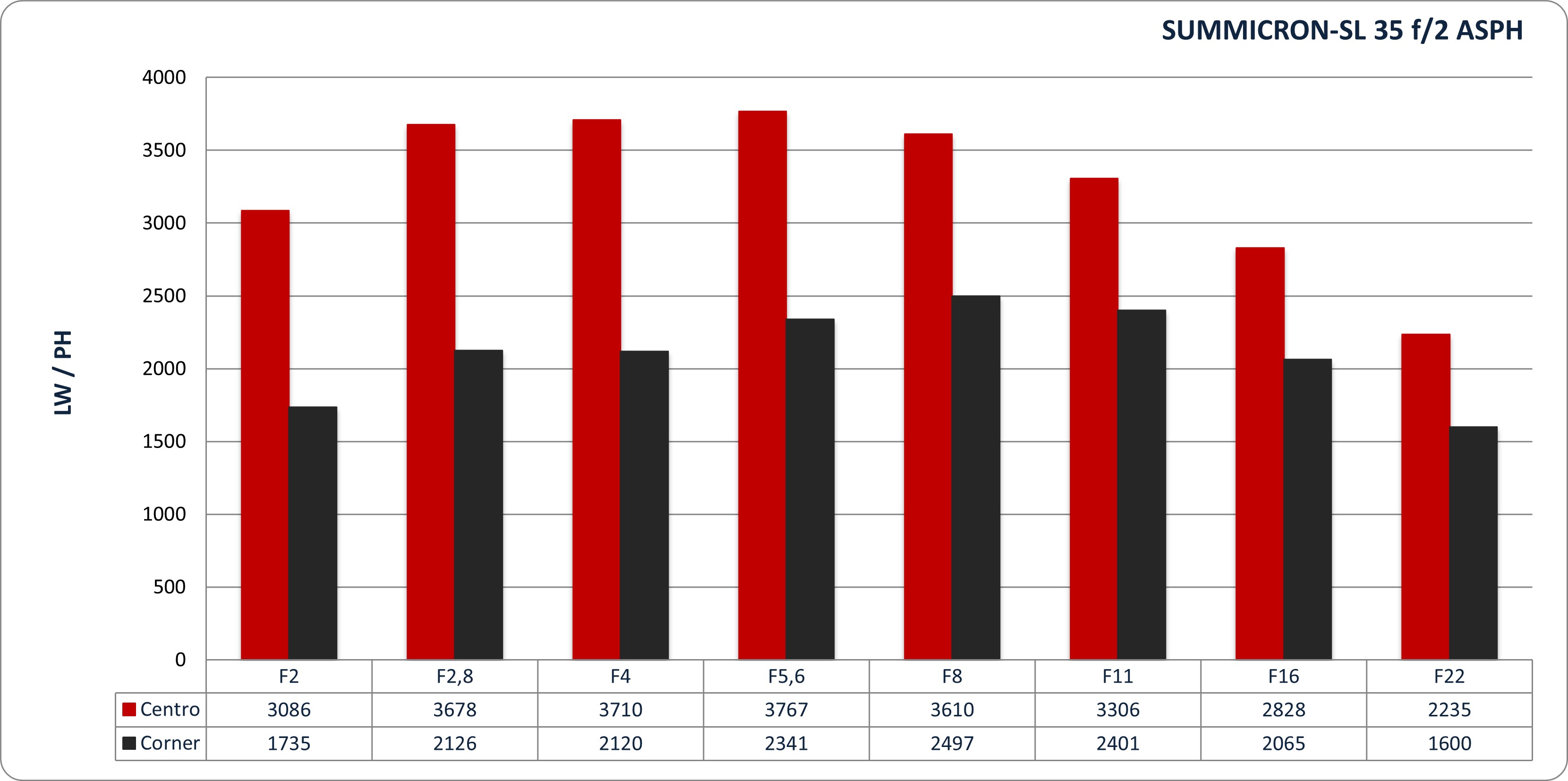 Il Summicron-SL 35 f/2 ASPH si è comportato molto bene in termini di risoluzione al centro, dove ha sfiorato le 3800 LW/PH, corrispondenti su questo sensore a 0,47 C/P, molto molto vicino al limite teorico di 0,5. Il buon risultato è corroborato da un punteggio già superiore a 3000 LW/PH a f/2 e superiore a 3500 LW/PH tra f/2.8 e f/8 compresi.