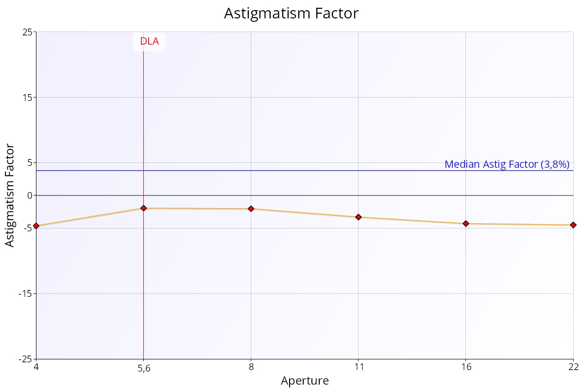 L'astigmatismo consiste nella differente nitidezza in direzione orizzontale e verticale. Una piccola differenza è fisiologica, ma tale scarto non dovrebbe superare il 10% e questo obiettivo, con una media tra 3,6% (70mm) e 3,8% (200mm), rientra abbondantemente nella fascia ottimale.