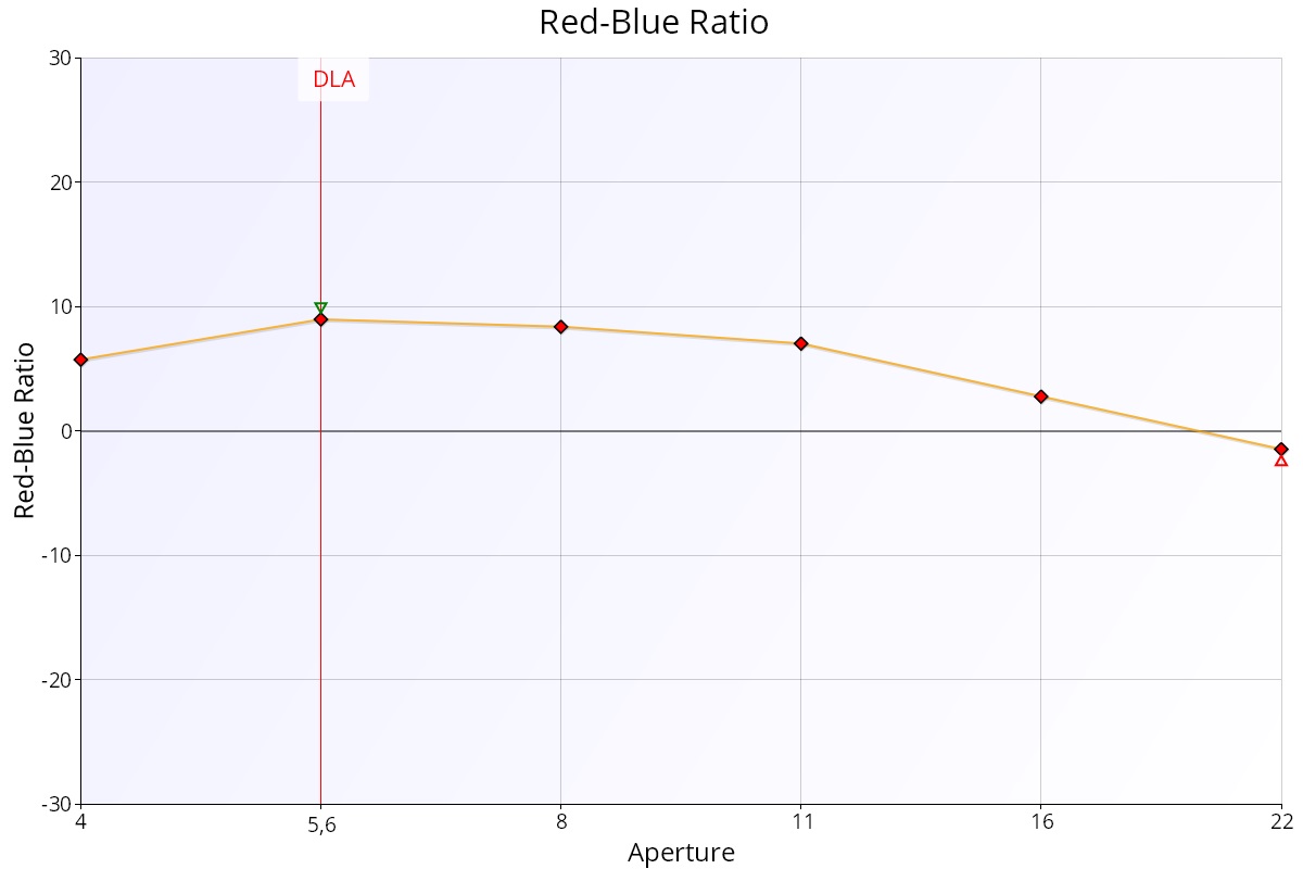 Infine, il cosiddetto "rapporto rosso-blu" non è altro che una misura di aberrazione cromatica, che gli obiettivi pregiati tendono tenere meglio sotto controllo grazie alla presenza nello schema ottico di elementi pregiati (soprattutto lenti a bassa dispersione). Anche in questo caso, uno scarto di più o meno 10 punti rispetto allo zero centrale è da considerarsi un ottimo risultato.