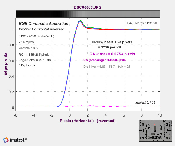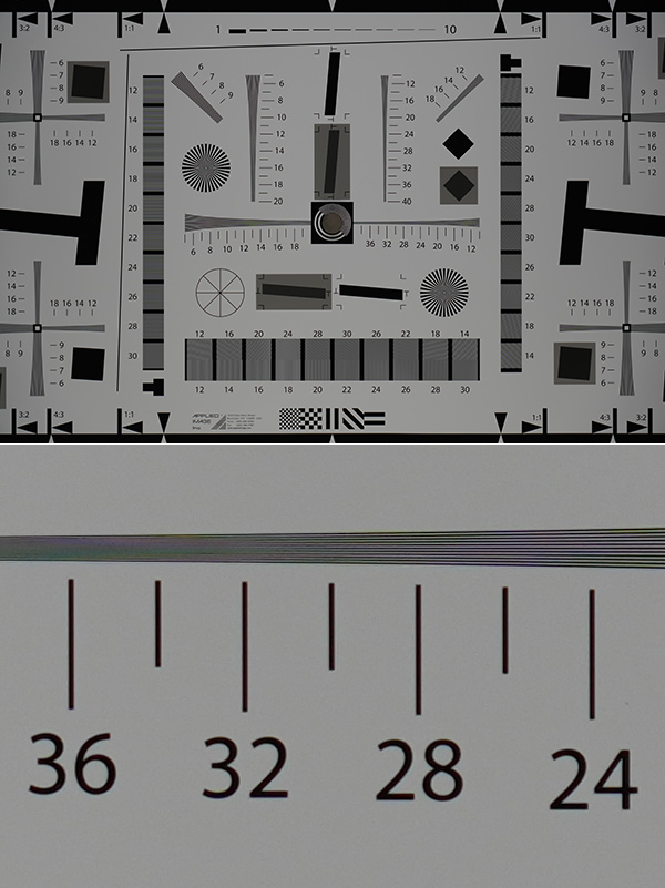 Per quanto riguarda la qualità d'immagine fotografica, una prima analisi condotta solo su file JPEG mostra risultati promettenti. Abbiamo un punteggio MTF nell'intorno delle 3200 LW/PH, coerente con analisi visiva (estinzione linee convergenti a 3200 LW/PH), con linee parallele leggibili fino al limite massimo di 3000 LW/PH).