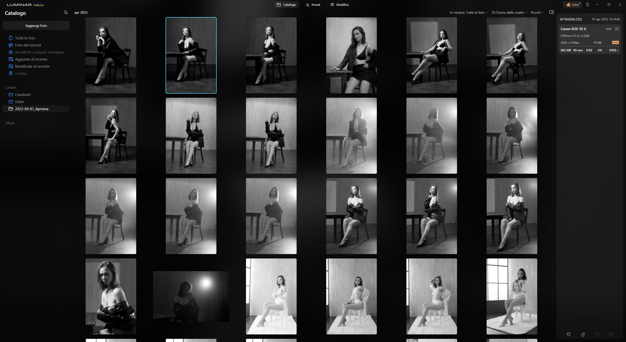 Una volta scelta la foto da elaborare, la cosa più semplice e automatica che si può fare è utilizzare uno dei Preset, che funzionano in modo del tutto analogo ai filtri di qualunque App mobile: un click, e via (qui sopra, alcuni esempi applicati al ritratto).