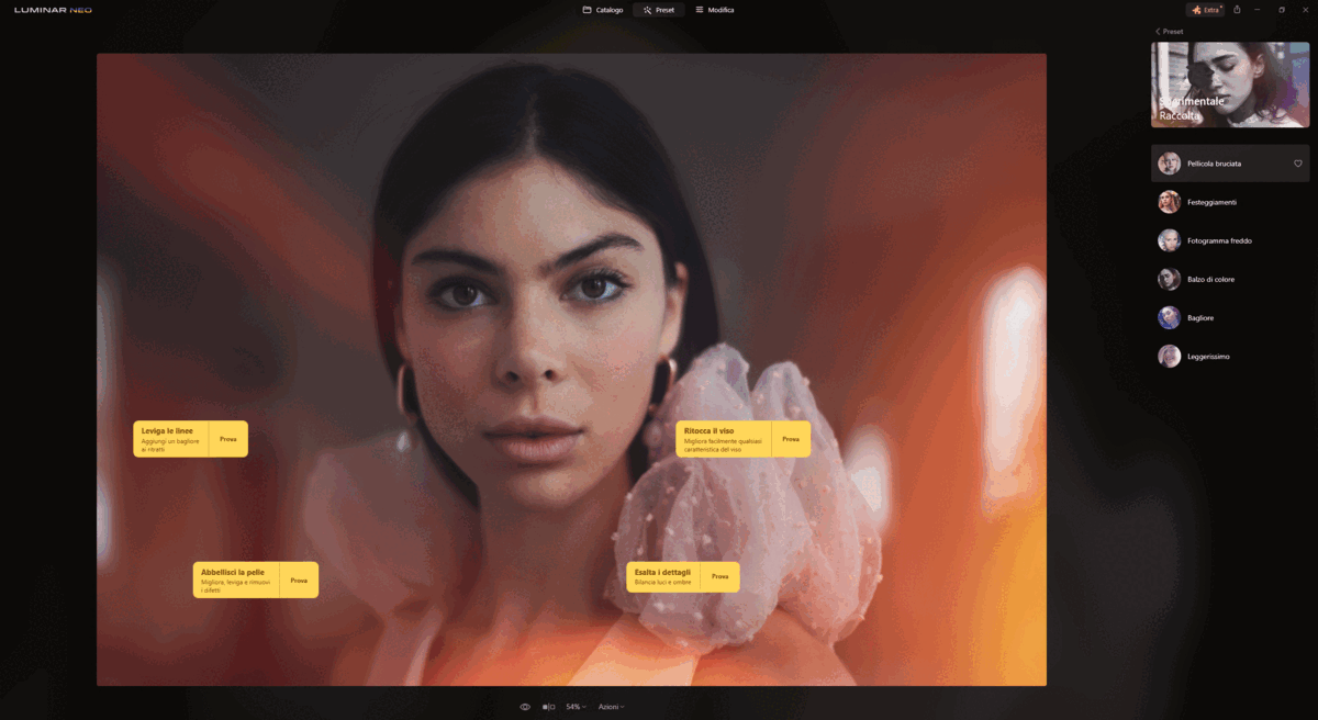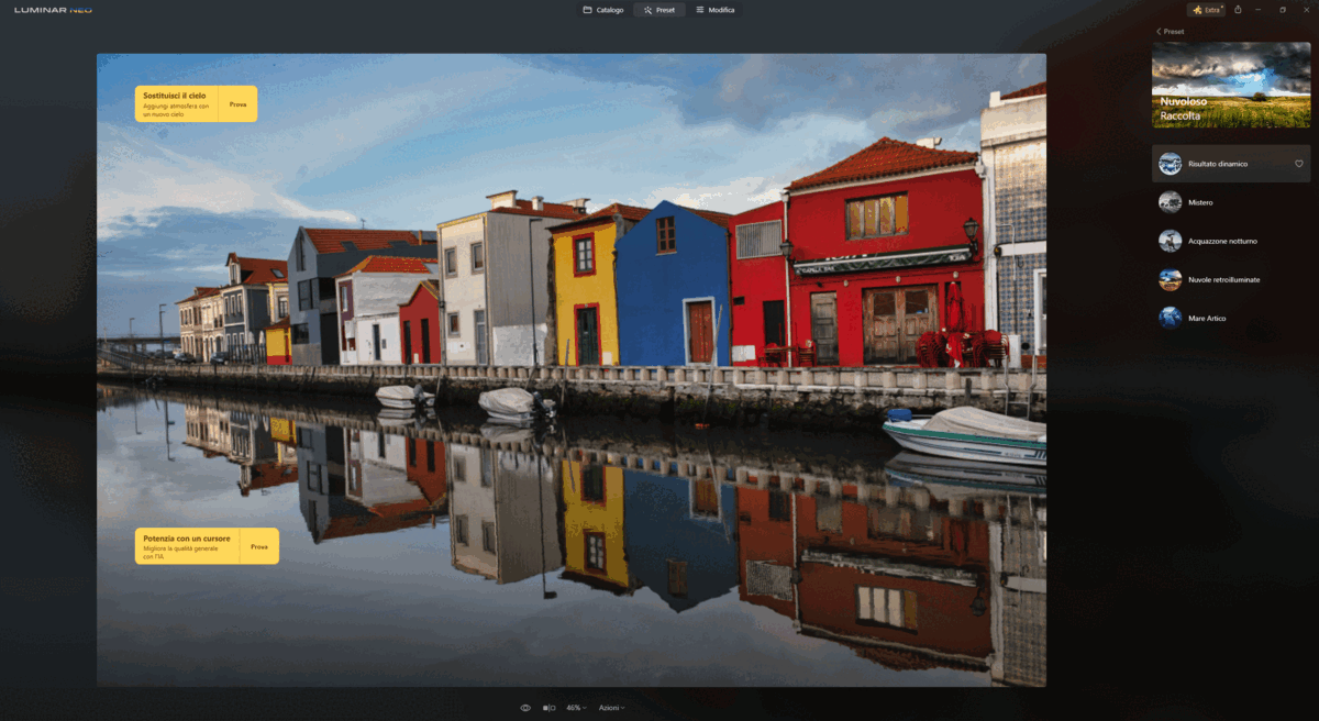 Luminar Neo si presenta con un'interfaccia "minimal", estremamente pulita e razionale, divisa in tre aree principali: Catalogo, per la gestione delle foto su disco; Preset, per il miglioramento in un click; infine, Modifica, dove si trovano gli strumenti più sofisticati, che rimangono comunque molto semplici da usare grazie alle "magie" dell'AI.