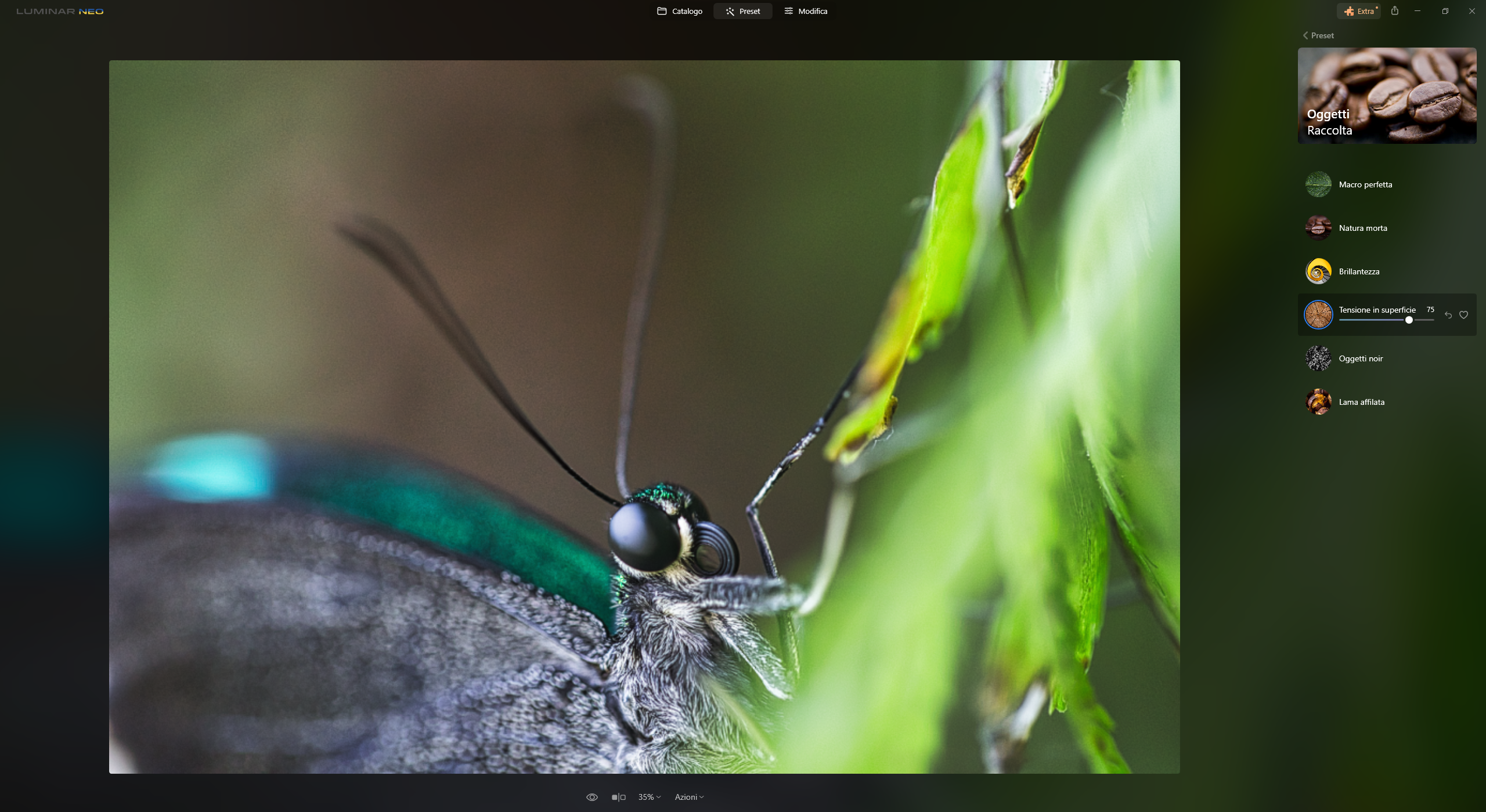 Selezionando una foto, Luminar Neo ne analizza il contenuto e propone automaticamente una selezione di preset adatti all'immagine – ad esempio, nel caso della farfalla, ci sono stati proposti i set relativi a natura e macro. Naturalmente, è sempre possibile scegliere manualmente da un elenco che include 8 categorie (Essenziali, Madre natura, Macro, Stile di vita, Paesaggio, Ritratto Filmato e Area), ed è possibile marcare come preferiti alcuni di questi preset, per creare la propria selezione personale.